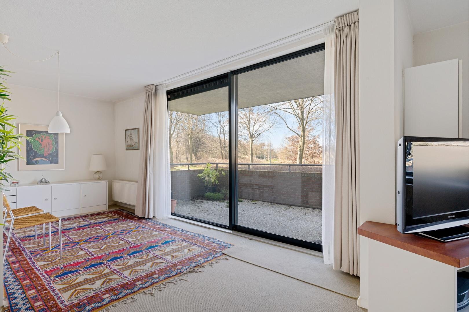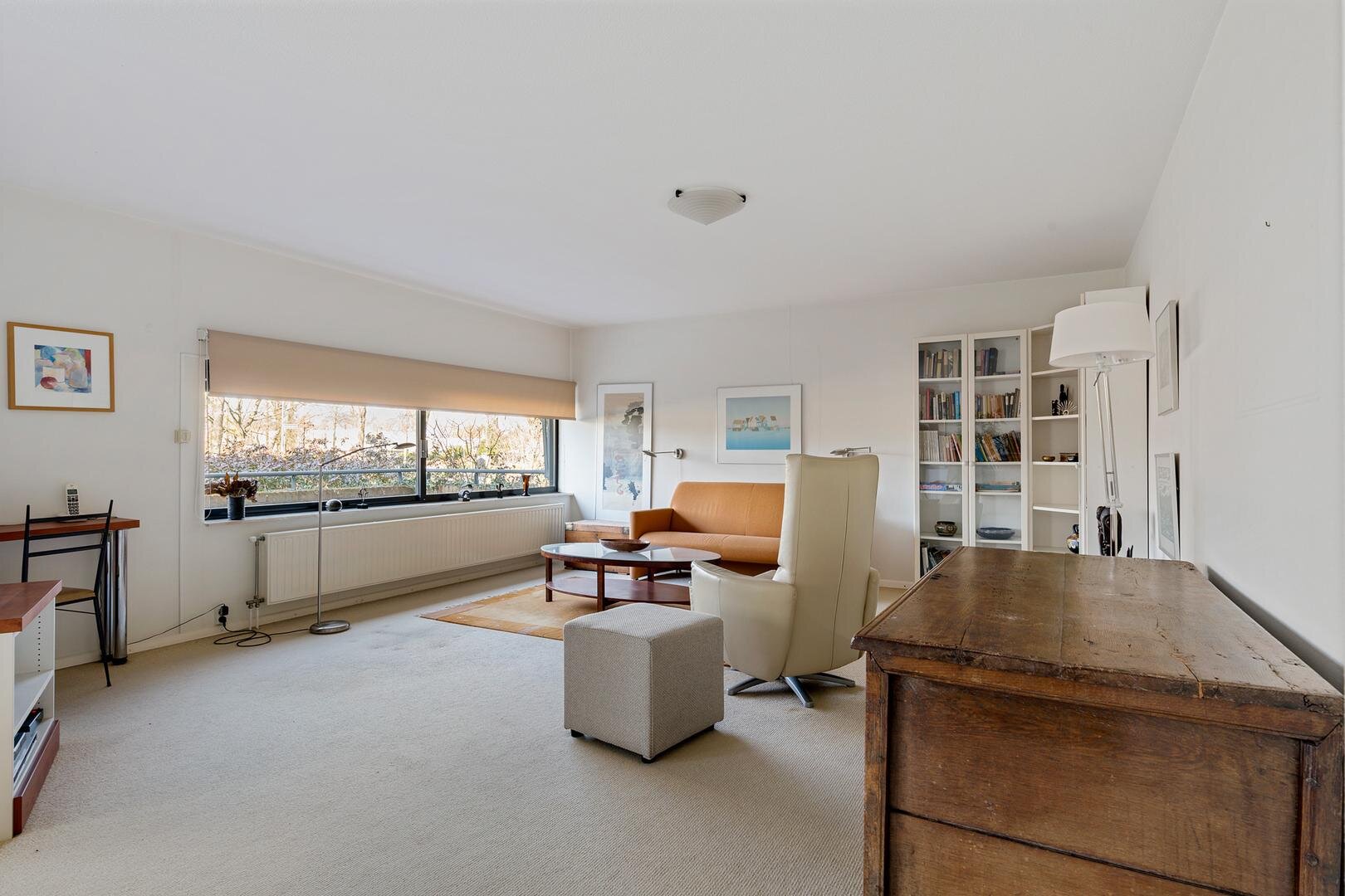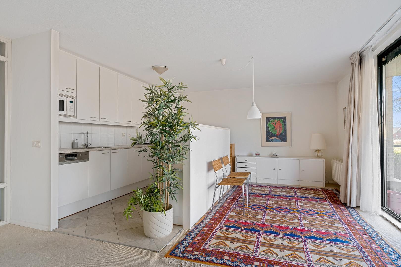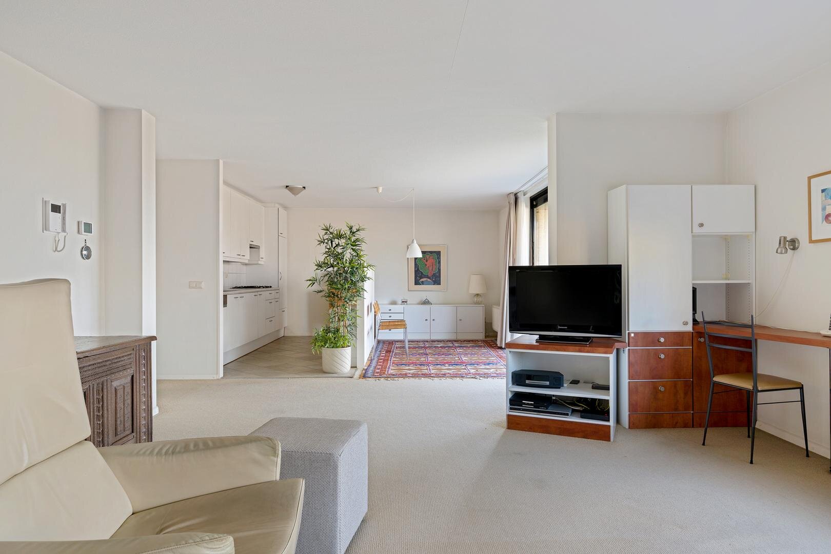 De royale woonkamer vormt het centrale leefgedeelte van het appartement en biedt volop ruimte voor een comfortabele zithoek. Dankzij de grote raampartijen valt er prettig daglicht naar binnen en ontstaat er een aangename leefruimte. Vanuit de woonkamer is tevens het riant terras bereikbaar, waar je heerlijk buiten kunt zitten. Aansluitend bevindt zich de eetkamer, die een prettige verbinding vormt tussen de woonkamer en de keuken en voldoende ruimte biedt voor een ruime eettafel. De keuken is eenvoudig uitgevoerd en voorzien van een koelkast, een 4-pits gasstel en een vaatwasser.