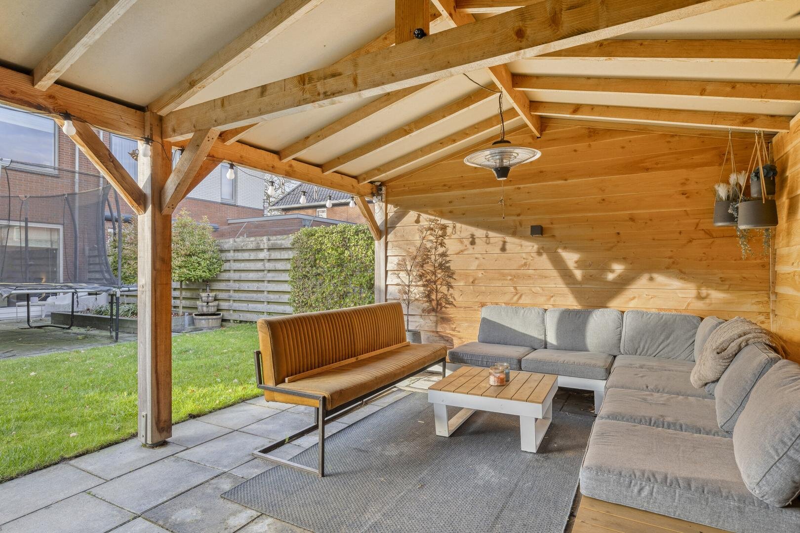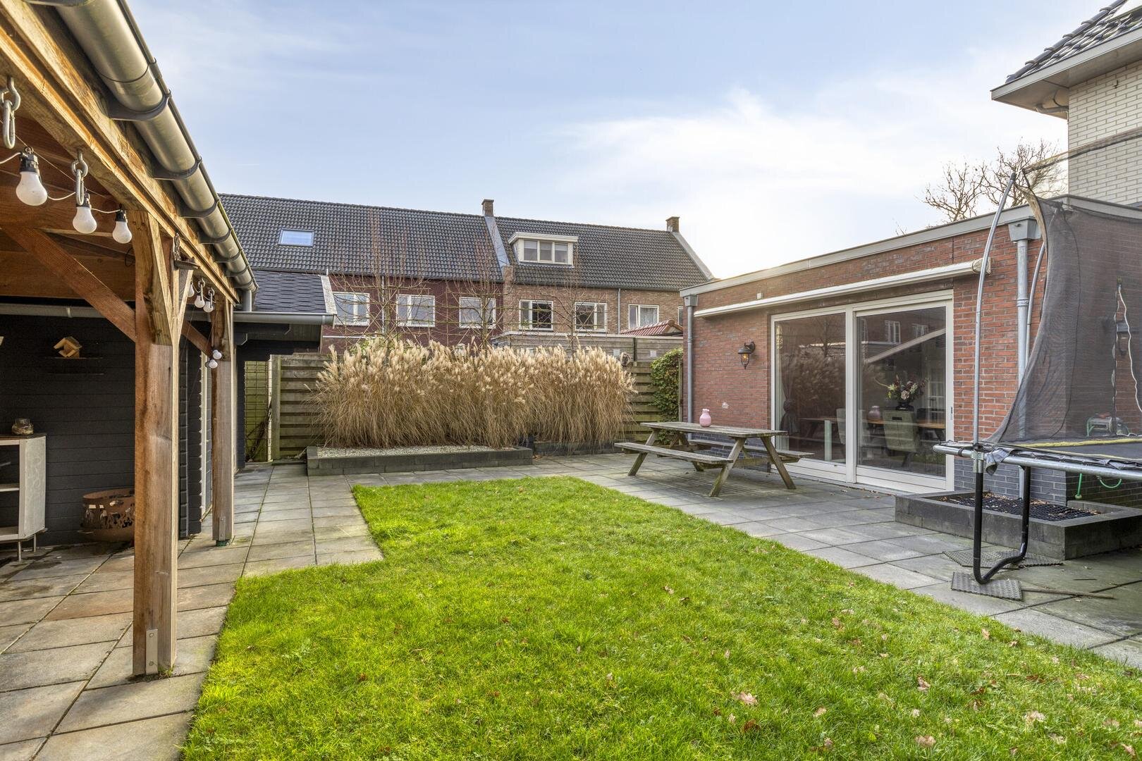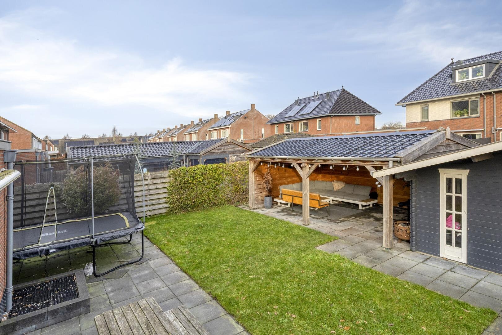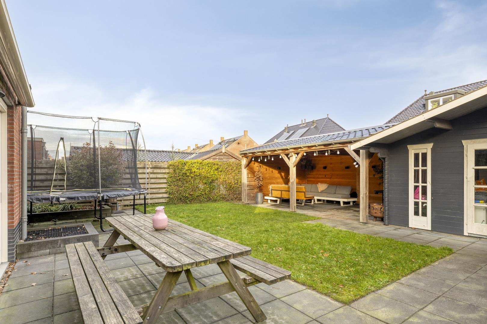 De verzorgde achtertuin is bereikbaar middels een achterom langs de woning en beschikt over een fraaie houten berging van circa 17 m² met een aangebouwde terrasoverkapping (ca. 6 x 4 m) voorzien van elektra. Een heerlijke plek om van de vroege lente tot late herfst comfortabel buiten te zitten. Altijd een prettige plek dus voor ontspanning en/of gezelligheid!