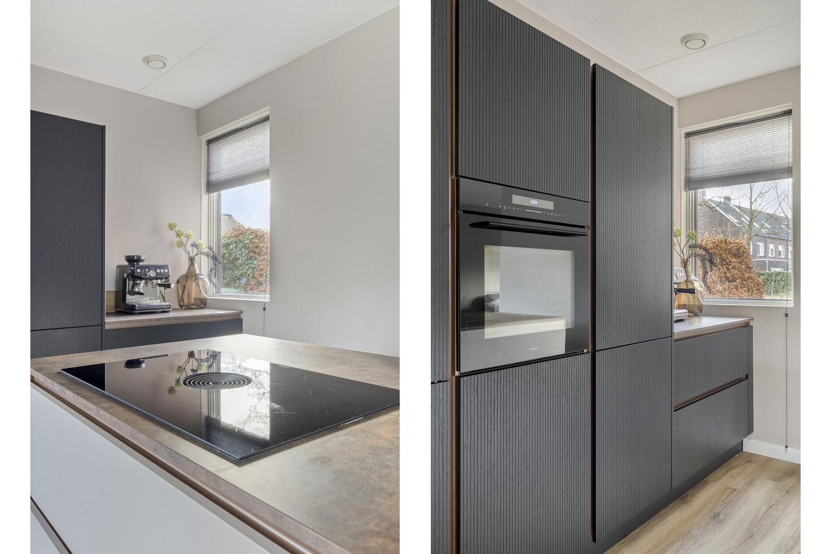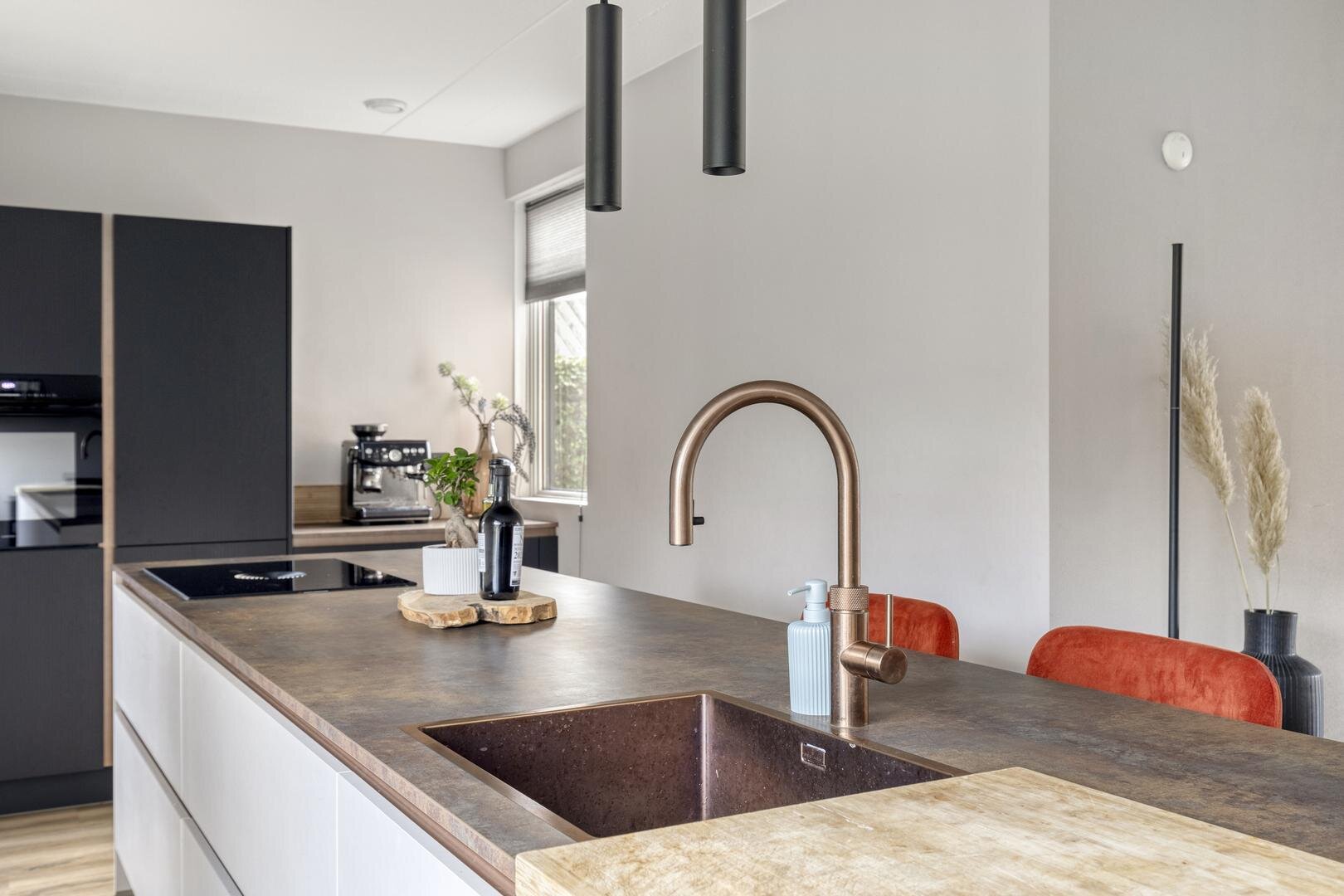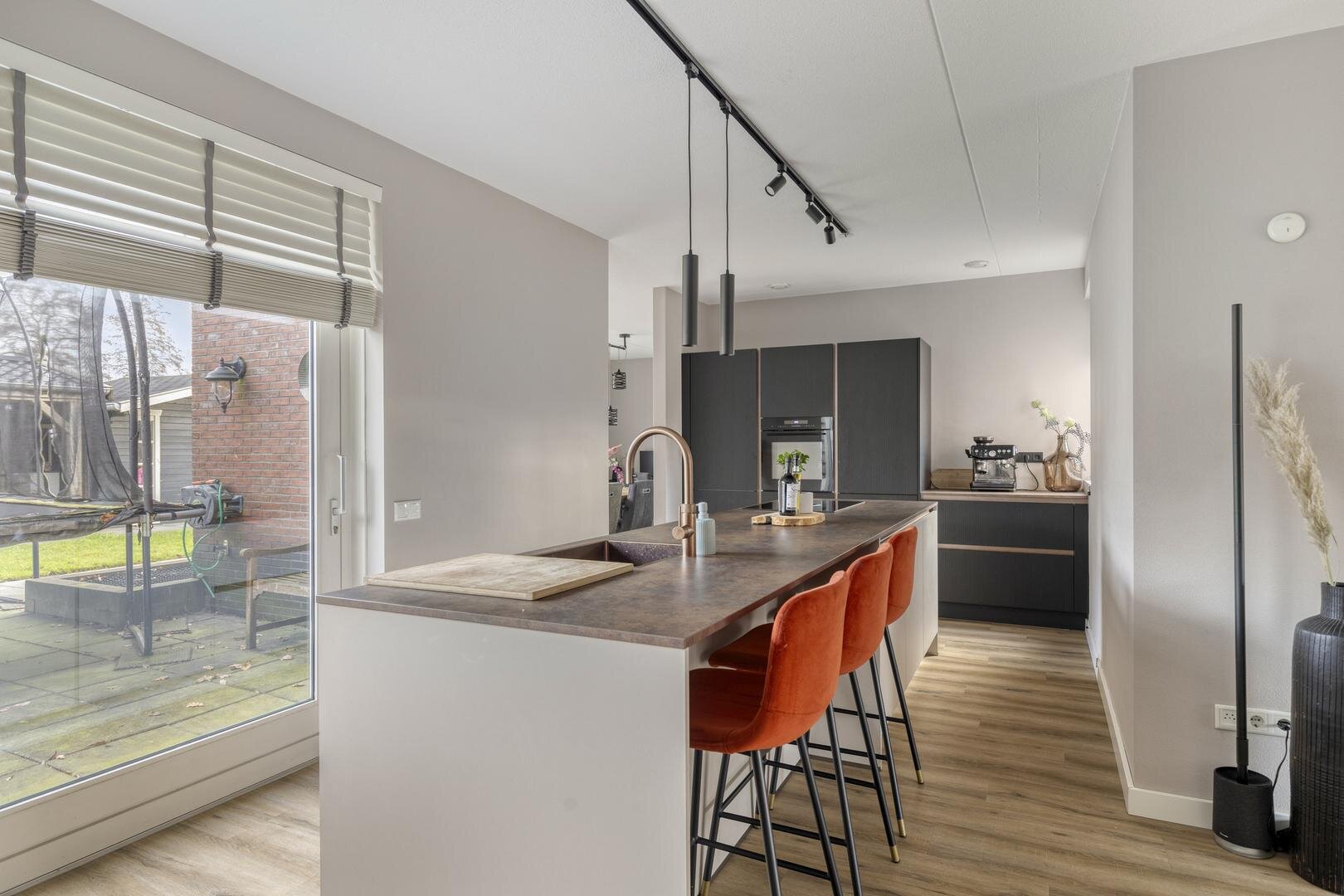Begane grond: Via de entree met modern toilet bereik je de zeer ruime en lichte living, verdeelt in een woonkamer aan de straatzijde, een centraal gelegen keuken en een tuingerichte eetkamer. De totale afmeting van deze ruimte is maar liefst 62 m² en aan de achterzijde zijn 2 schuifpuien aanwezig waardoor er volop verbinding is met de tuin. De erker aan de voorzijde zorgt voor een prettige lichtinval en als gevolg van de ligging tegenover een groenstrook ervaar je hier ook opvallend veel privacy. Centraal in de ruimte is de keuken gepositioneerd, een combinatie van een groot kook-/spoeleiland en een kastenwand met 'koffiecorner'. De keuken is in 2024 geplaatst, uitgevoerd in een moderne stijl en o.a. voorzien van inductiekookplaat met veldafzuiging, vaatwasser, Quooker, oven en koelkast. Vanuit de eetkamer is de bijkeuken bereikbaar, die tevens dienst doet als entree vanaf de oprit.
