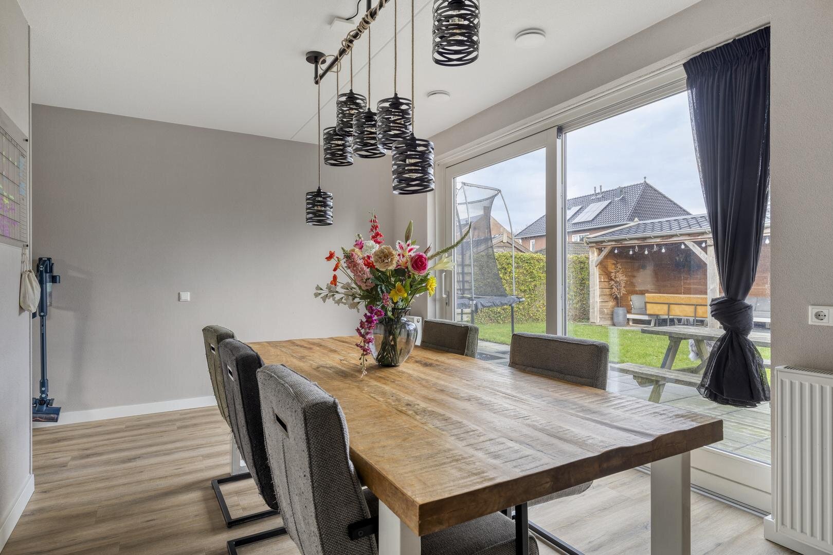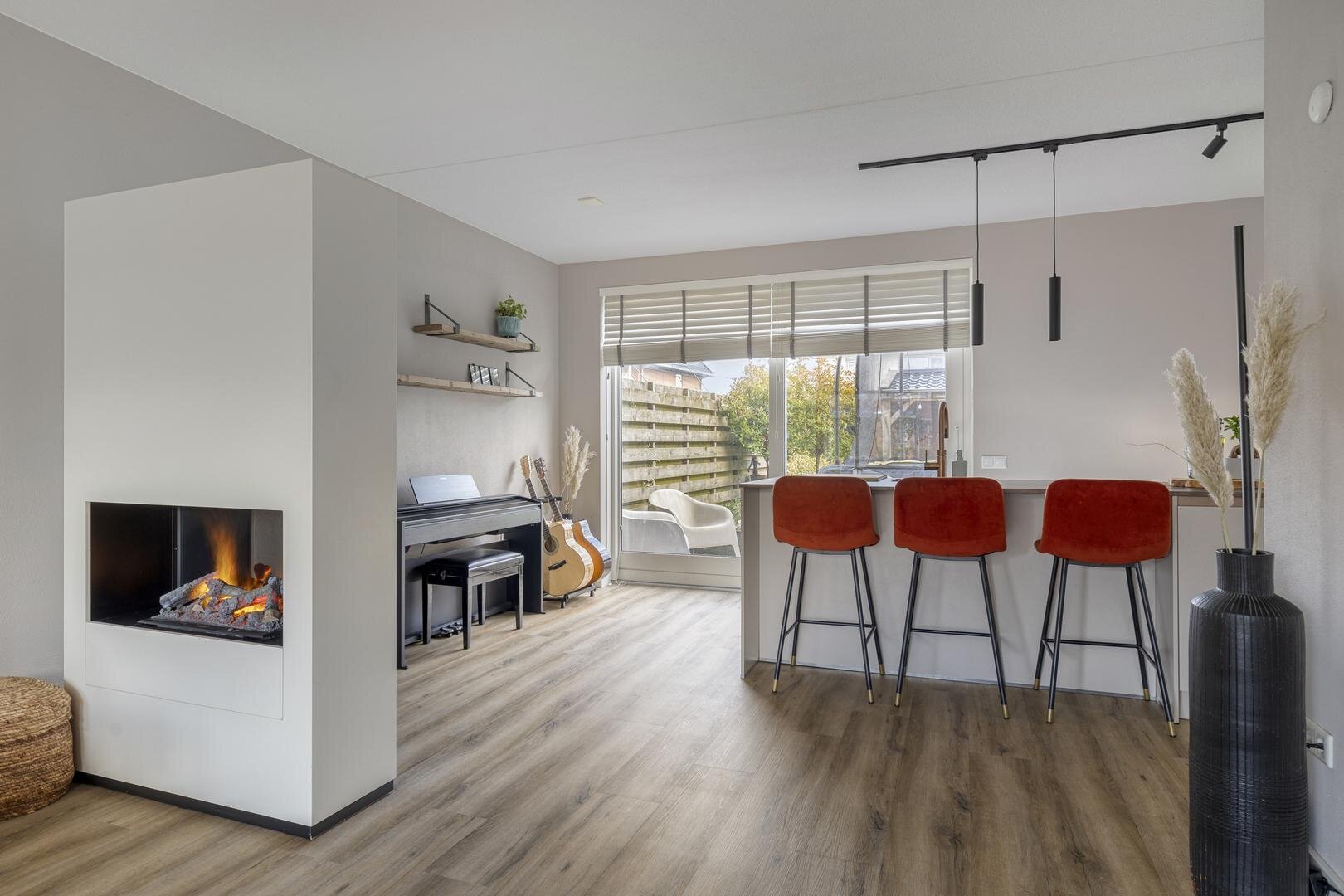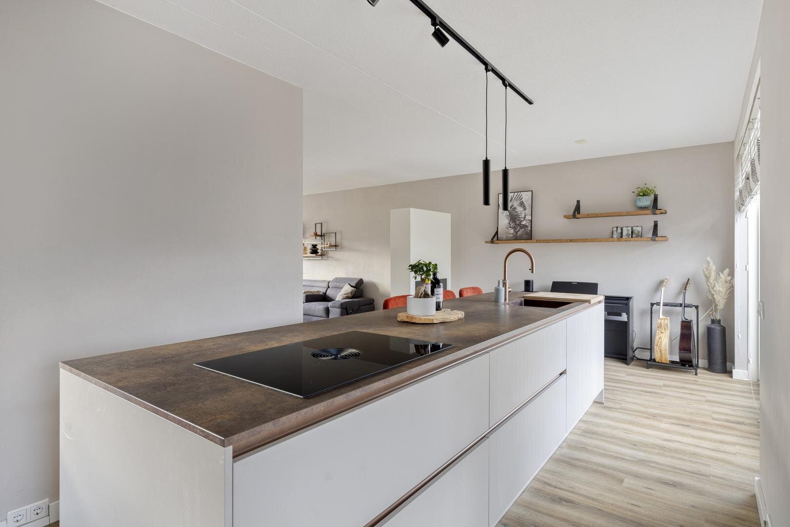 Begane grond: Via de entree met modern toilet bereik je de zeer ruime en lichte living, verdeelt in een woonkamer aan de straatzijde, een centraal gelegen keuken en een tuingerichte eetkamer. De totale afmeting van deze ruimte is maar liefst 62 m² en aan de achterzijde zijn 2 schuifpuien aanwezig waardoor er volop verbinding is met de tuin. De erker aan de voorzijde zorgt voor een prettige lichtinval en als gevolg van de ligging tegenover een groenstrook ervaar je hier ook opvallend veel privacy. Centraal in de ruimte is de keuken gepositioneerd, een combinatie van een groot kook-/spoeleiland en een kastenwand met 'koffiecorner'. De keuken is in 2024 geplaatst, uitgevoerd in een moderne stijl en o.a. voorzien van inductiekookplaat met veldafzuiging, vaatwasser, Quooker, oven en koelkast. Vanuit de eetkamer is de bijkeuken bereikbaar, die tevens dienst doet als entree vanaf de oprit.