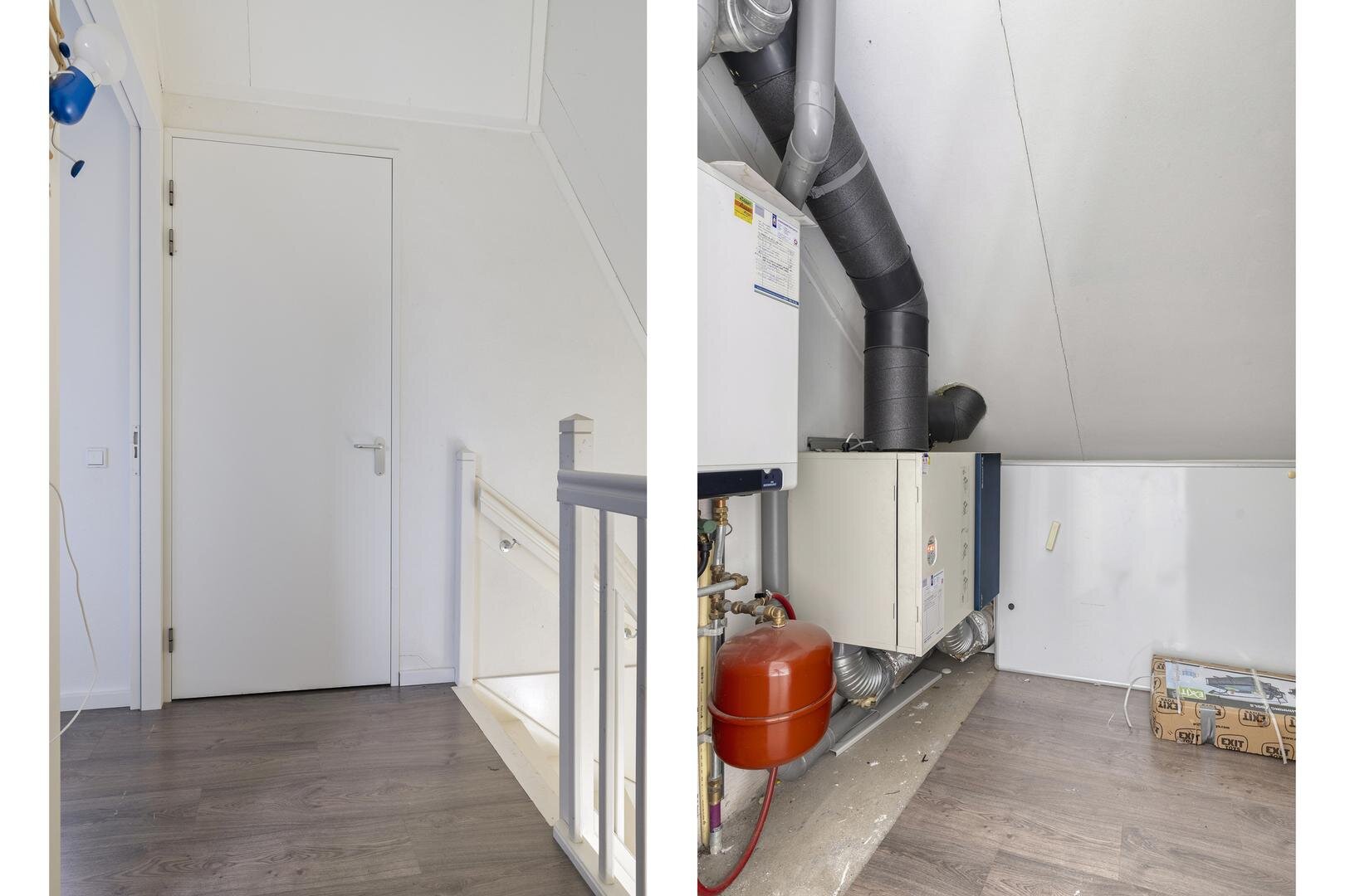 Tweede verdieping: Hier bevinden zich nog twee volwaardige slaapkamers met een vloeroppervlak van ca 9 en 10 m² en bergruimte achter de knieschotten. Daarnaast is er vanaf de overloop toegang tot praktische bergruimte met o.a. ook ruimte voor de cv-installatie en het WTW-systeem.