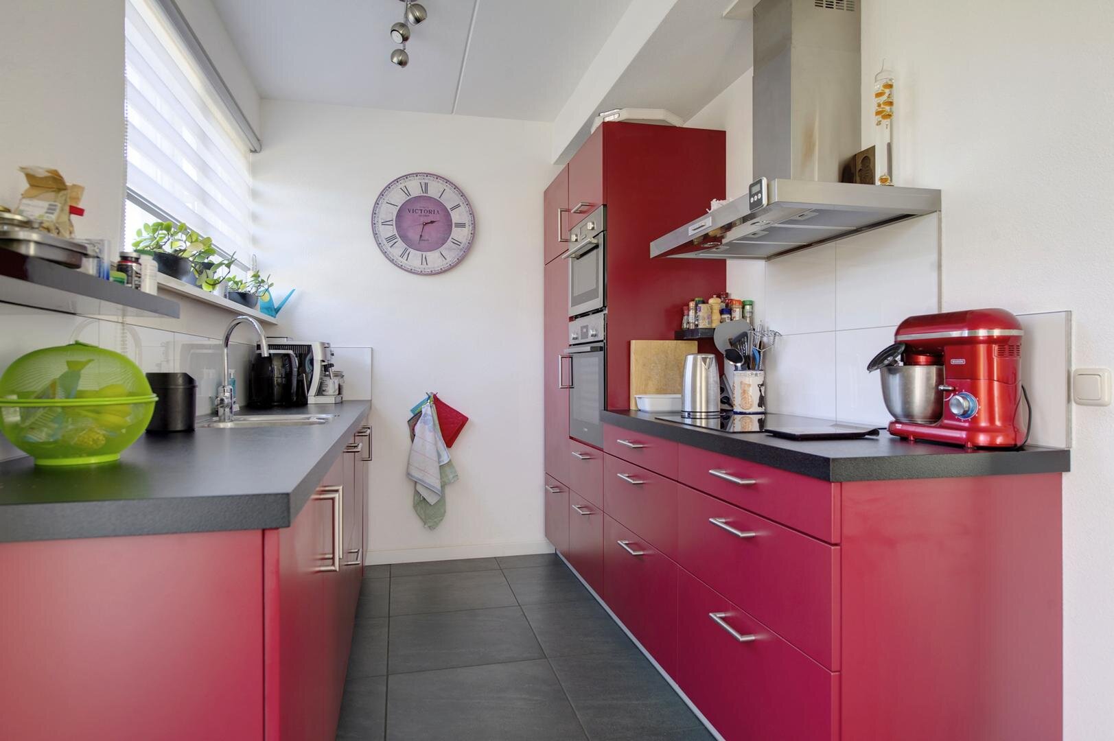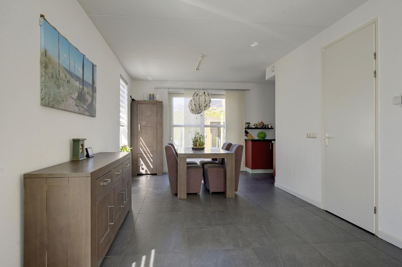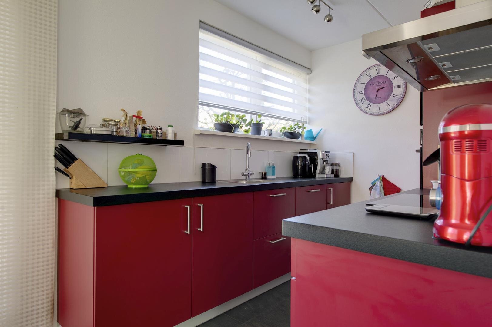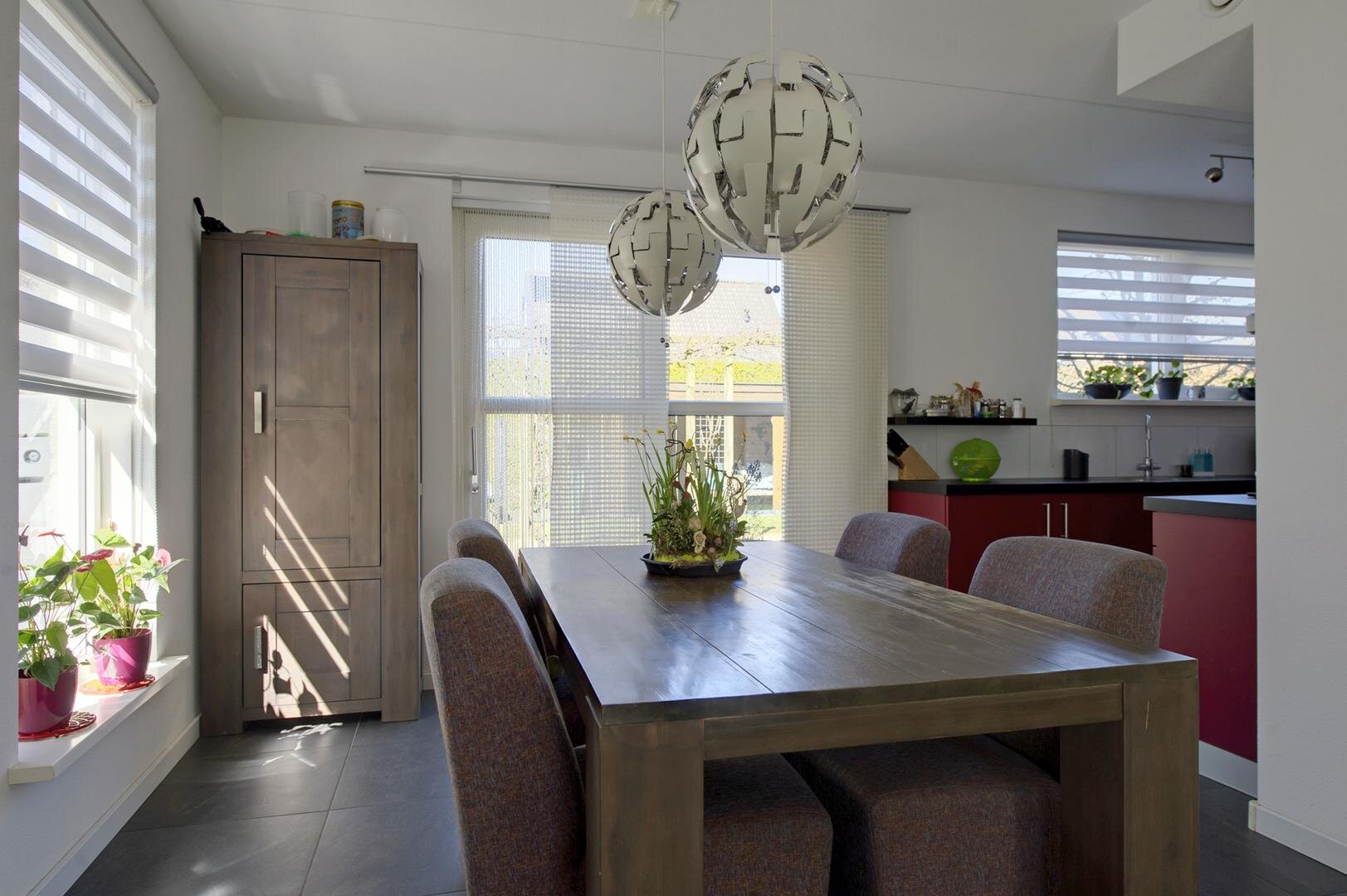 Aan de tuinzijde bevindt zich de eetkamer met aansluitend de keuken. De keuken is praktisch ingericht en via de schuifpui is er een directe verbinding met het terras, waardoor binnen en buiten mooi in elkaar overlopen.