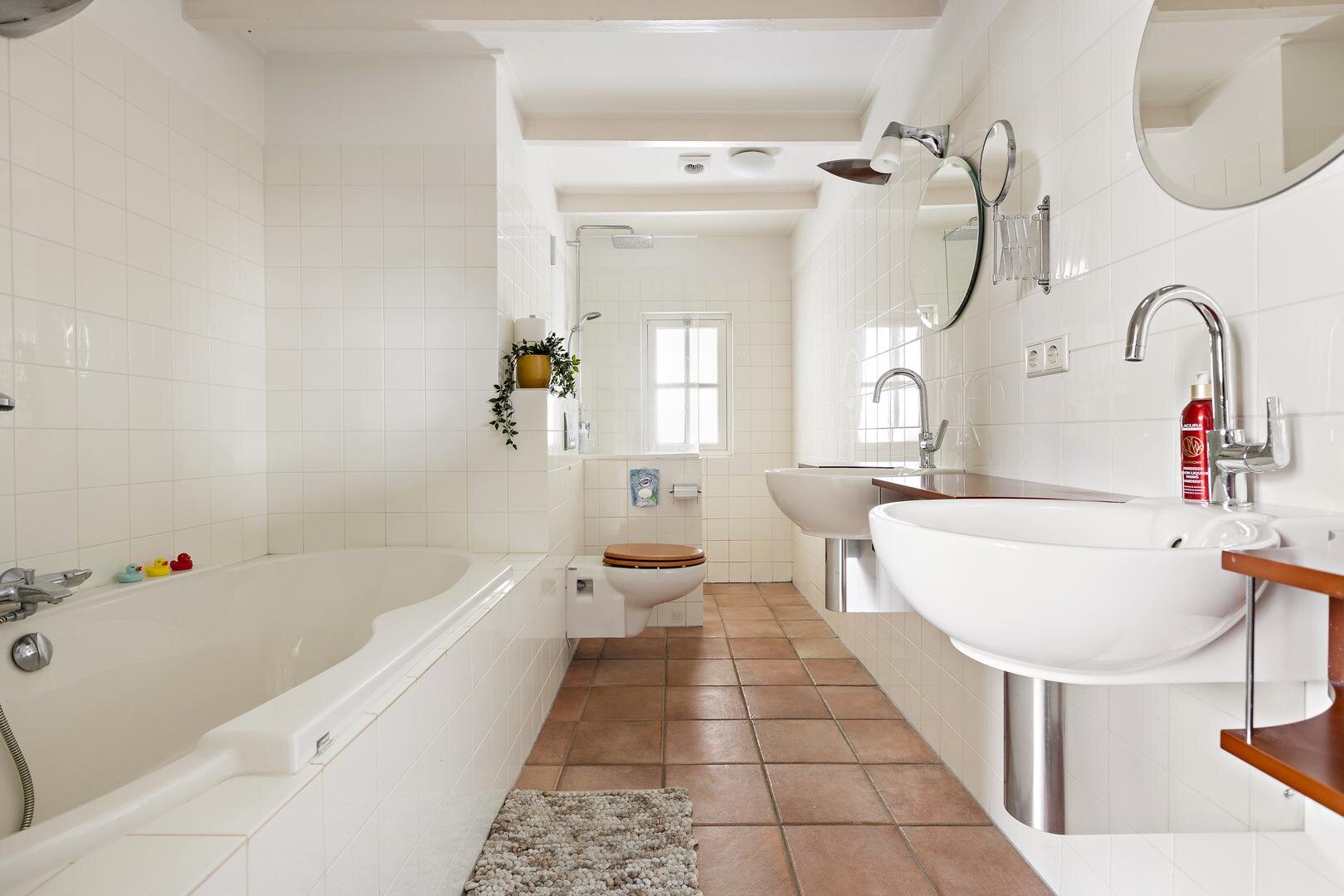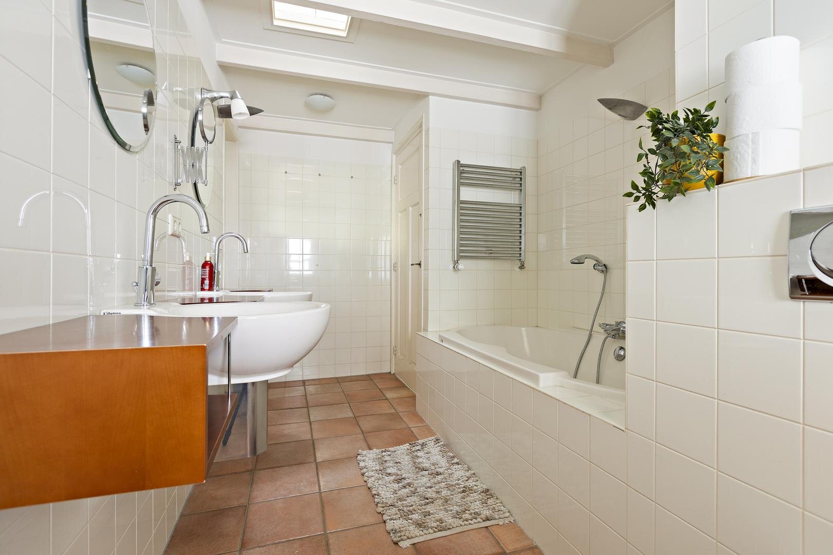 Op de begane grond bevindt zich tevens een ruime slaapkamer van circa 15 m². Aangrenzend ligt de badkamer van circa 9 m², voorzien van een douche, dubbele wastafels en een toilet. De badkamer is zowel vanuit de hal als vanuit de slaapkamer bereikbaar.
