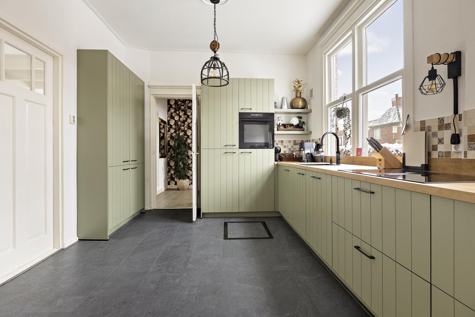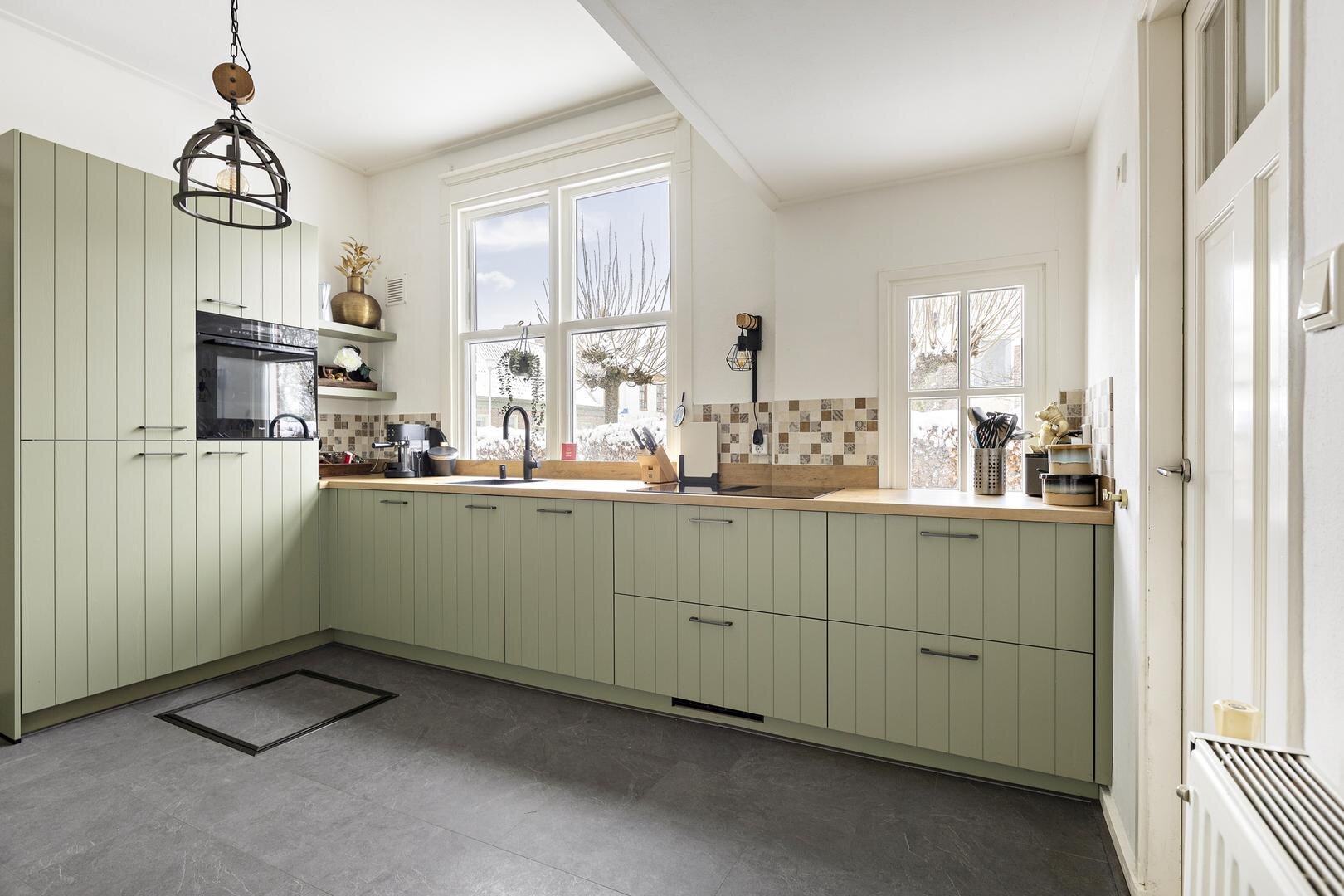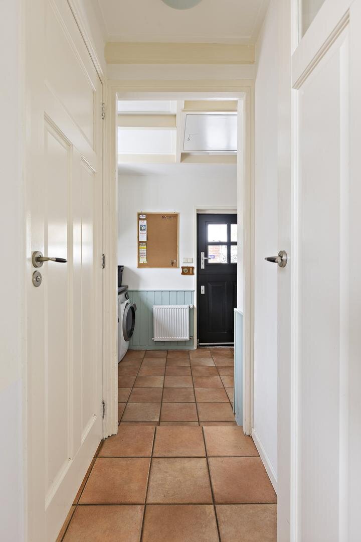 De keuken is in 2024 volledig vernieuwd en uitgevoerd als dichte hoekkeuken van circa 13 m². De keuken beschikt over veel kastruimte en moderne inbouwapparatuur, waaronder een oven, vaatwasser, quooker en inductie met ingebouwde afzuiging. Vanuit de keuken bereikt u de achterhal met toiletruimte en de praktische bijkeuken met toegang tot een zolder. De bijkeuken biedt tevens toegang tot de tuin.
