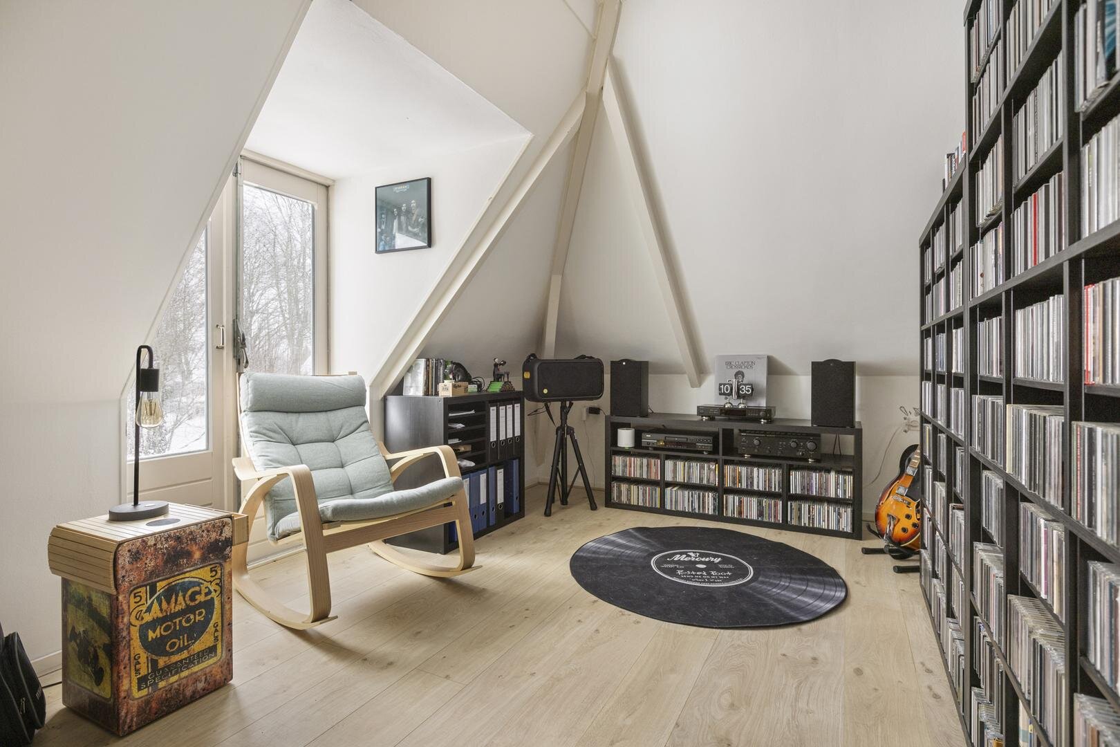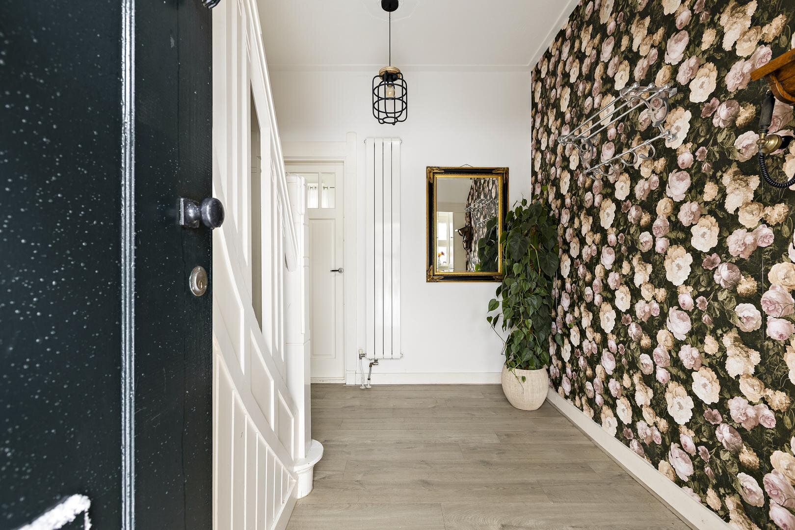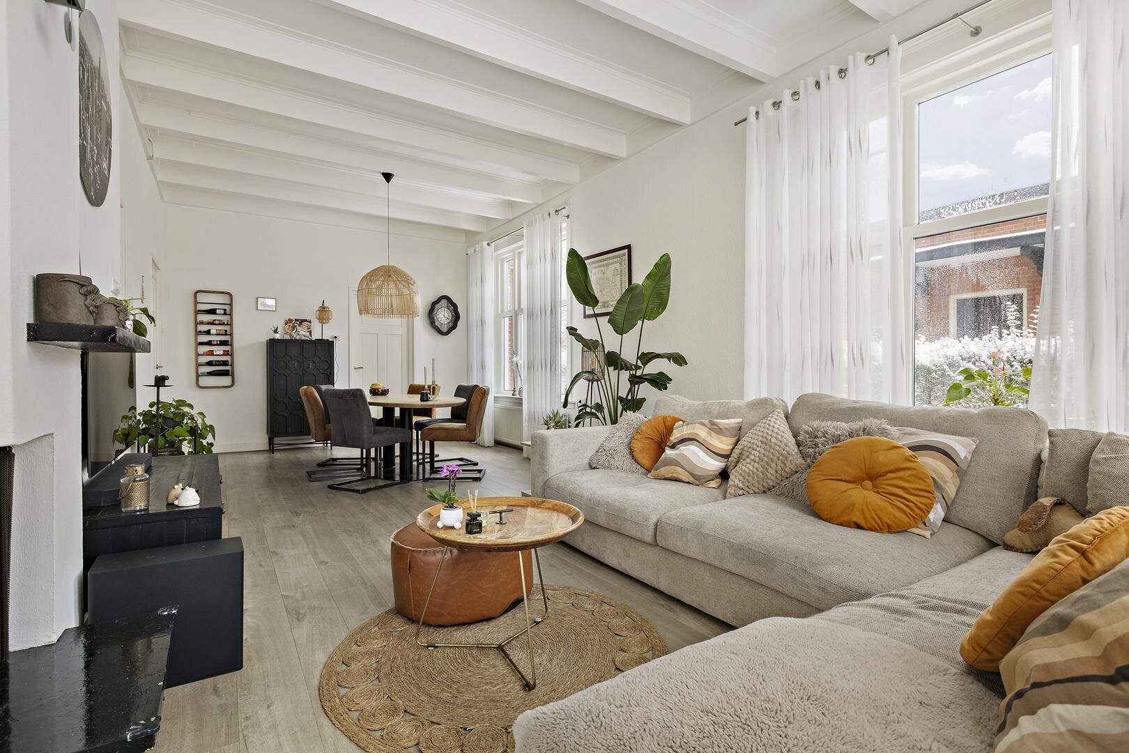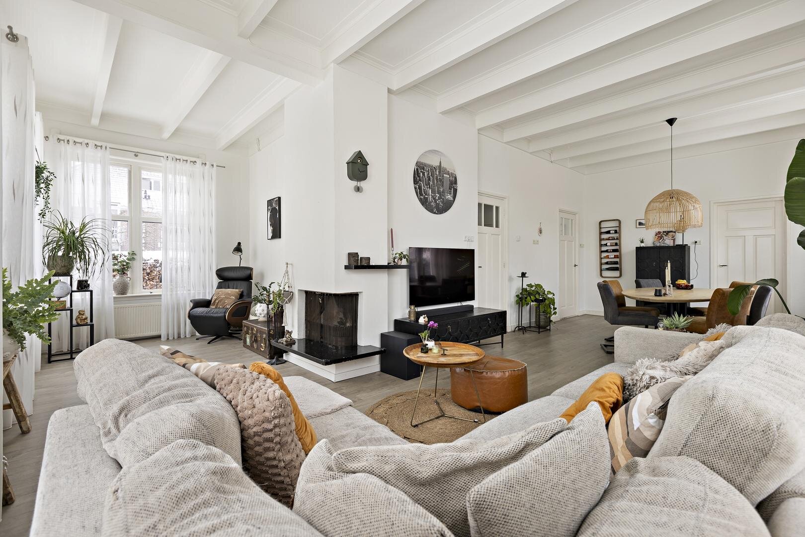 Via de entree komt u in de ruime hal met trapopgang naar de eerste verdieping en toegang tot de kelder. Vanuit de hal is de ruime woon-/eetkamer van circa 45 m² bereikbaar. De hoge, originele houten plafonds en de prettige lichtinval geven deze ruimte een warme en open uitstraling.