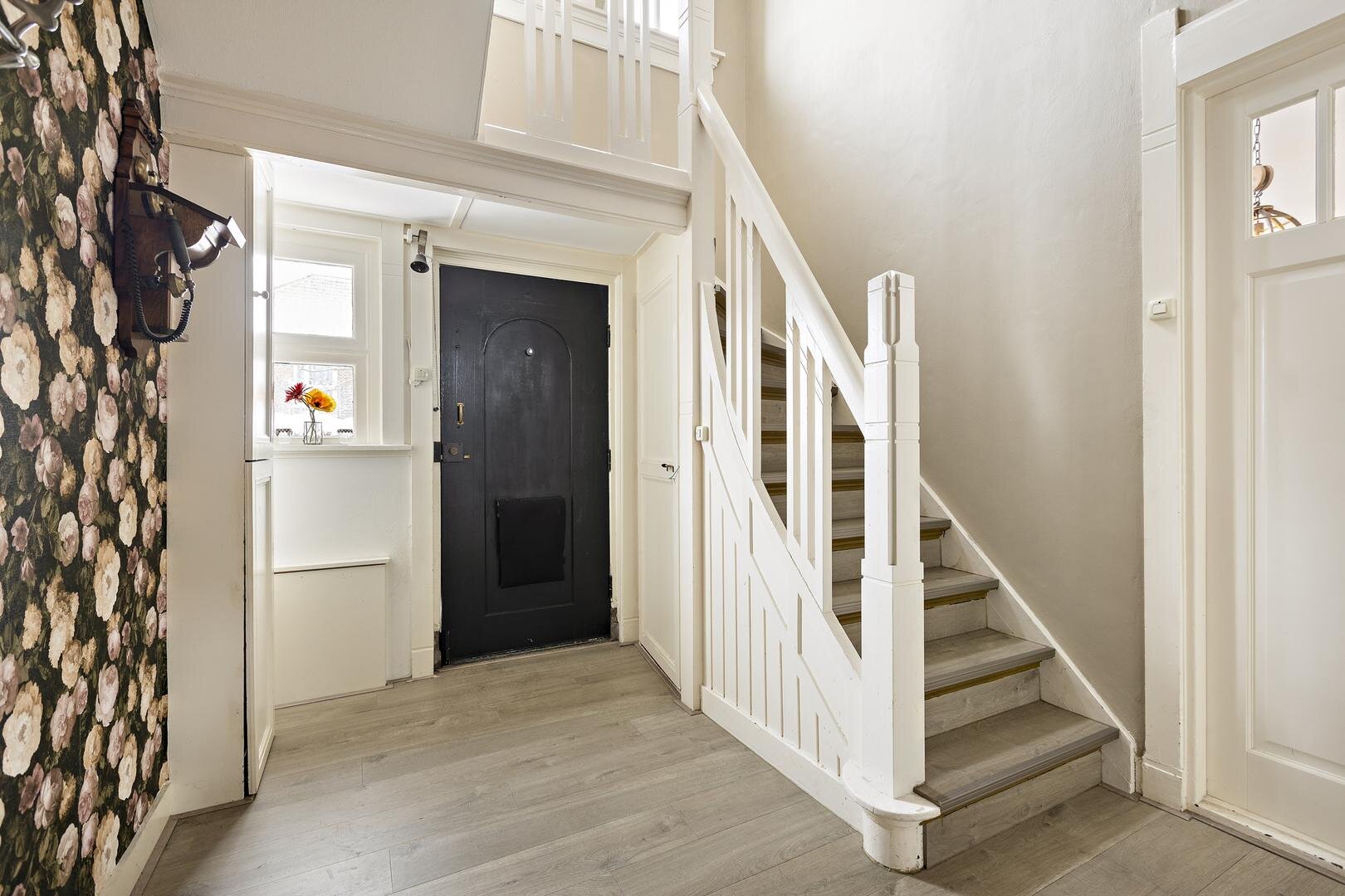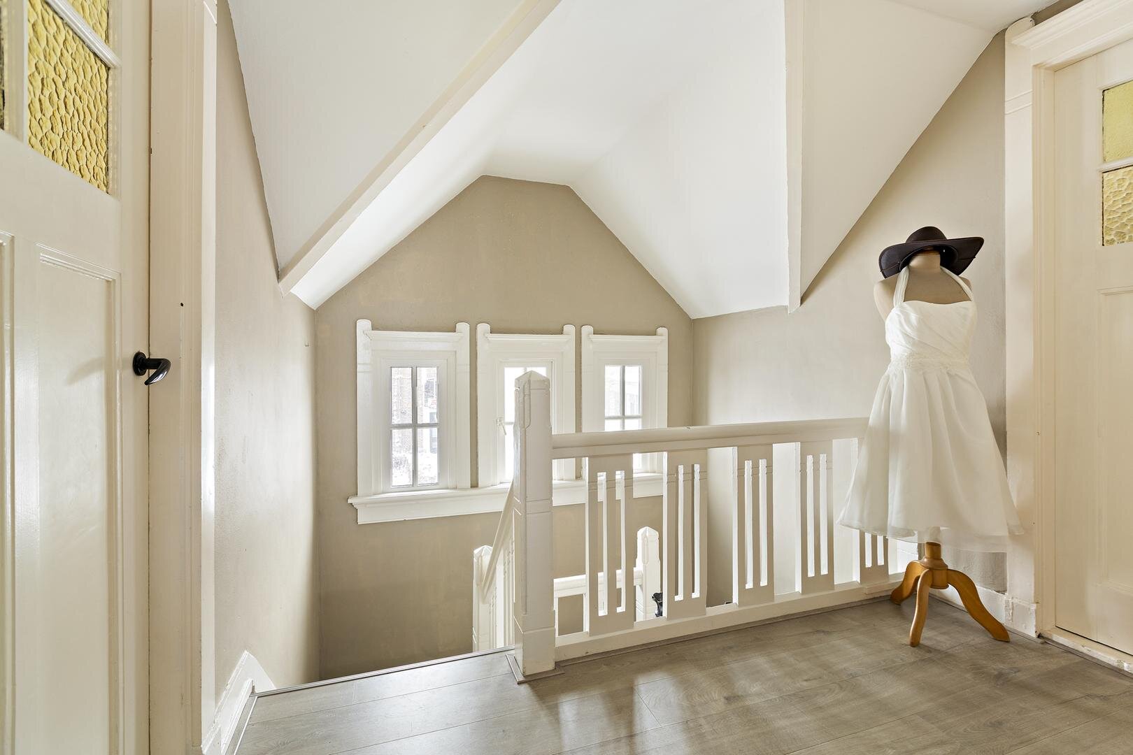 Via de karakteristieke bordestrap komt u op de overloop met vaste kast. Hier bevinden zich drie slaapkamers van circa 13, 13 en 11 m².