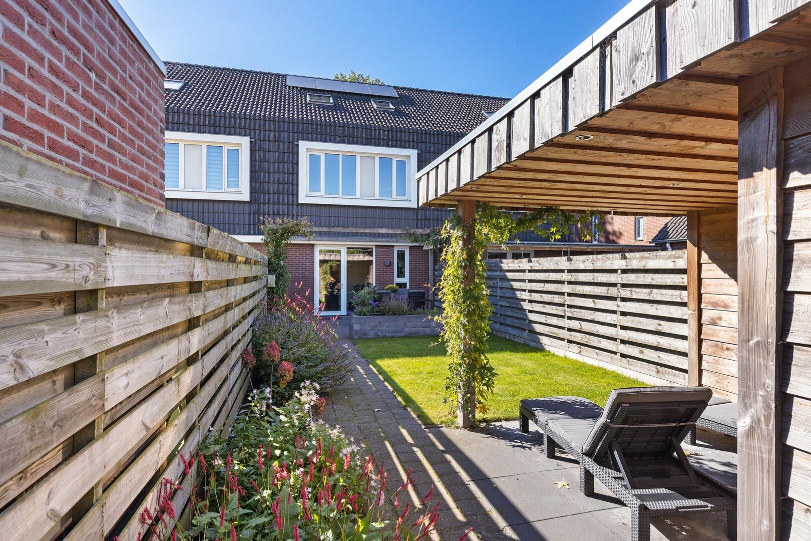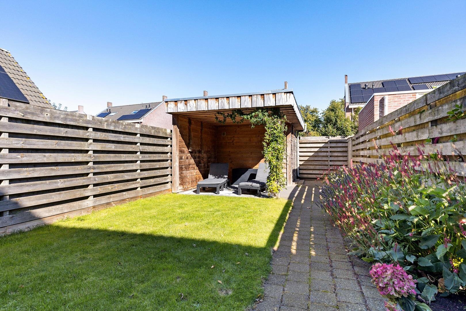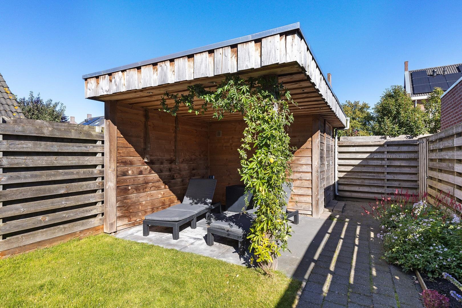 De achtertuin is verzorgd aangelegd en onderhoudsvriendelijk, zodat je er vooral van kunt genieten. Achterin de tuin staat een vrijstaande houten berging (ca. 6 m²) met elektra en een achterom – ideaal om fietsen en tuingereedschap netjes op te bergen. Extra pluspunt is de aangebouwde houten overkapping: een sfeervolle plek waar je het hele jaar door heerlijk kunt zitten. Dankzij de verlichting kun je hier ook ’s avonds nog heerlijk genieten van je tuin.