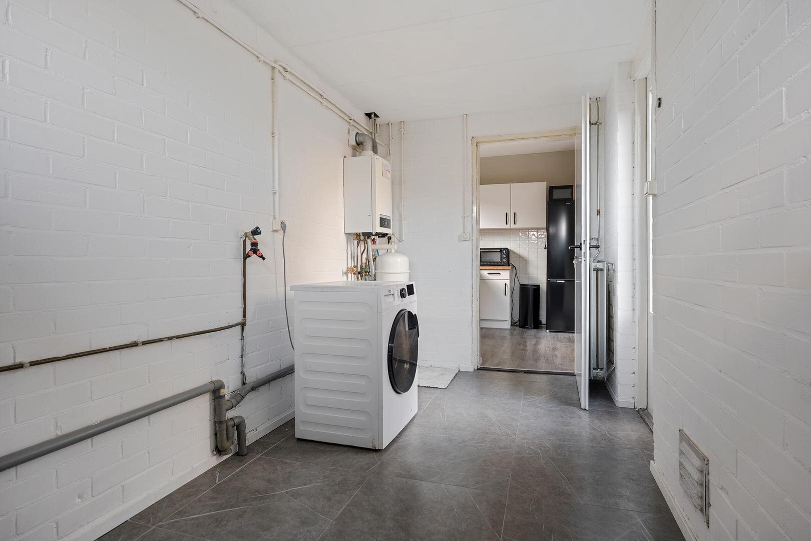 Begane grond: entree via de voordeur; hal met meterkast en trapopgang; toiletruimte met toilet en fontein; lichte woon-/eetkamer met open keuken (totaal ca. 36 m²); trapkast; bijkeuken met opstelling van de cv-ketel en witgoedaansluitingen.
