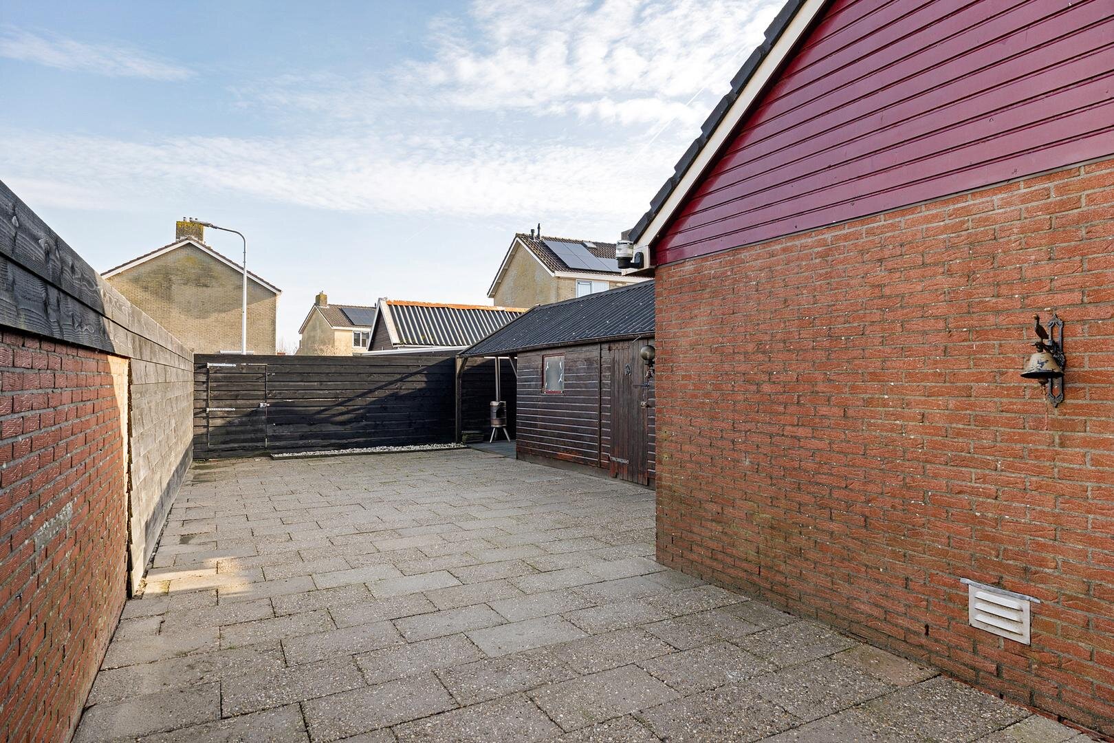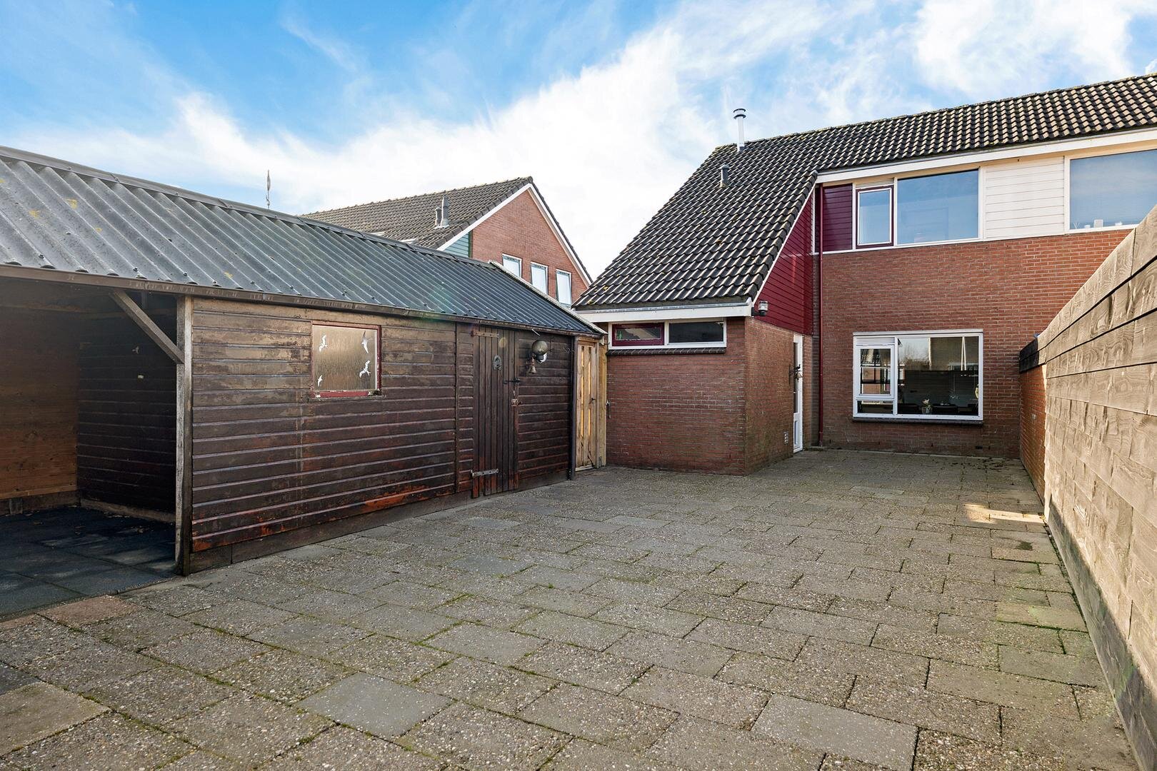 Aan de voorzijde bevindt zich de oprit met toegang tot de vrijstaande houten garage. De achtertuin is gelegen op het noordoosten en biedt voldoende ruimte om te genieten van het buitenleven. Via een achterom aan de Kerkstraat is de tuin tevens goed bereikbaar.