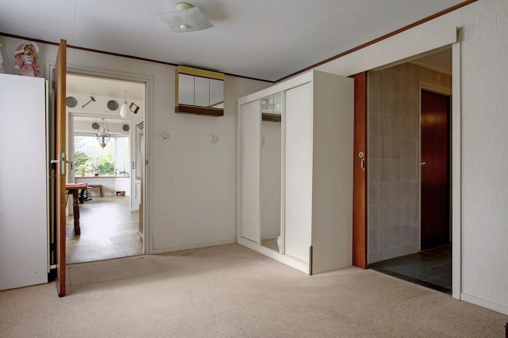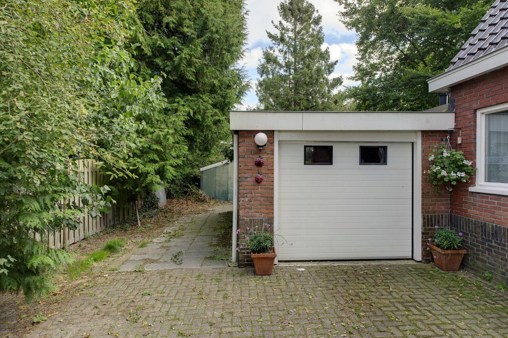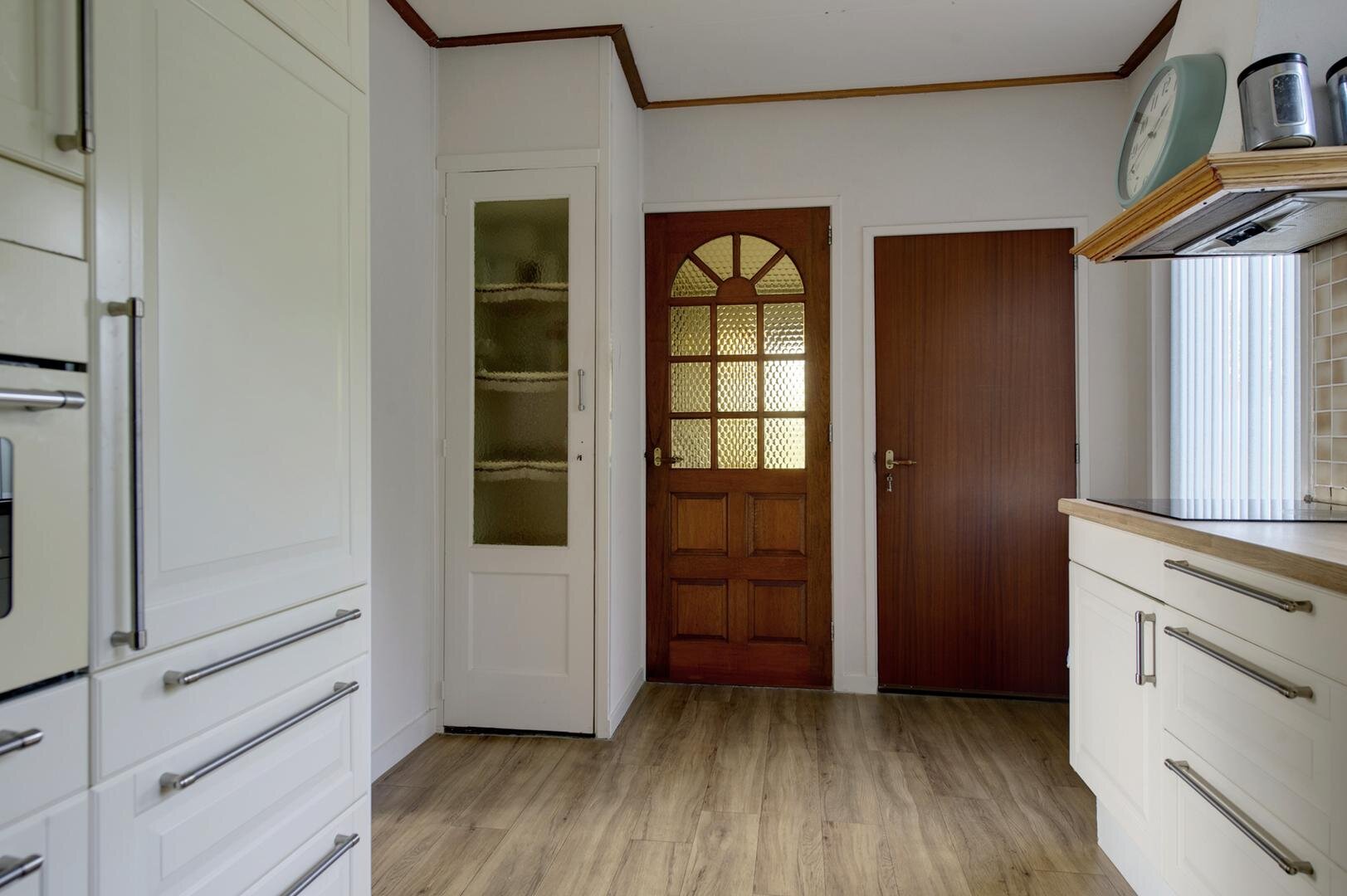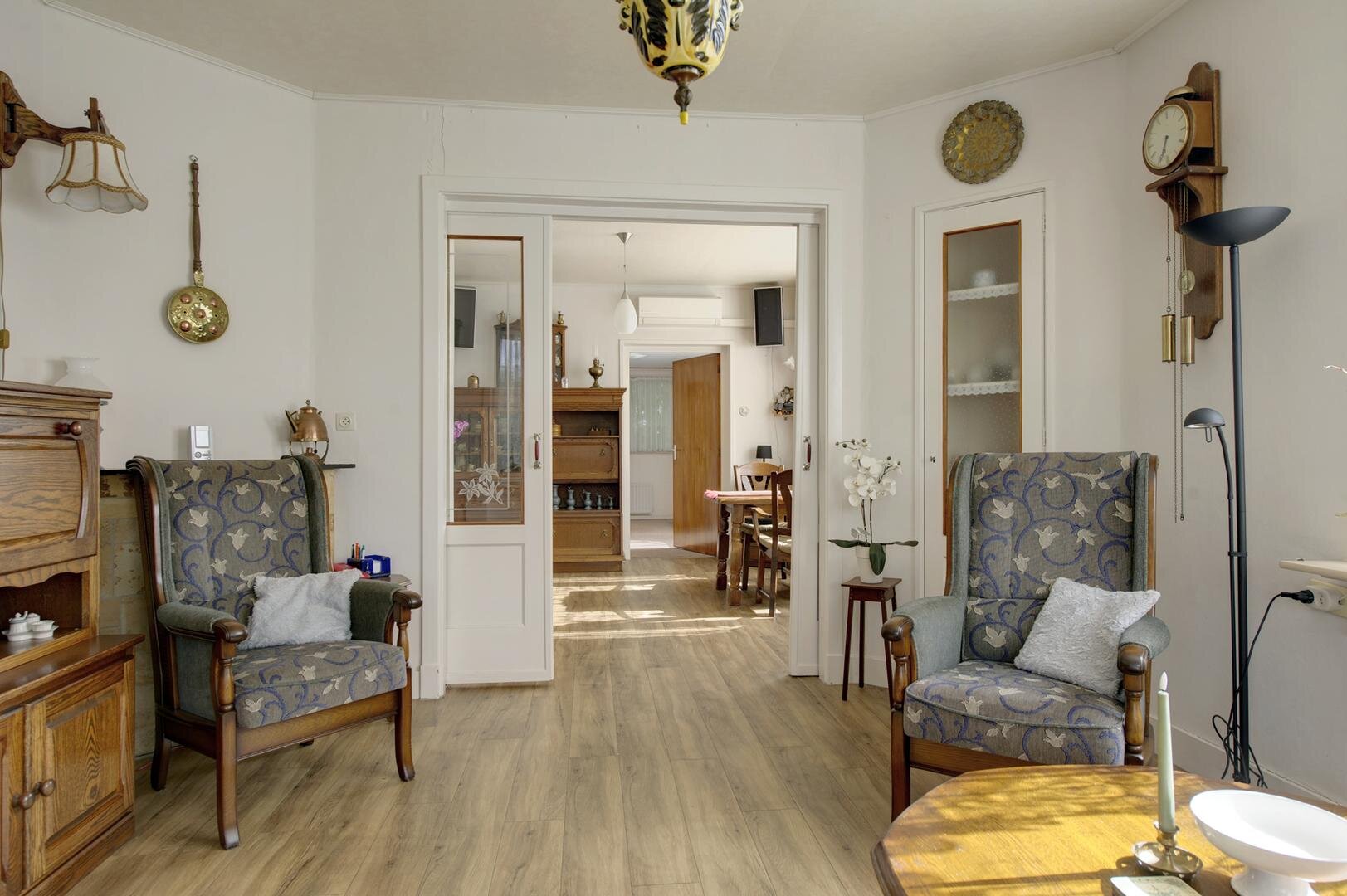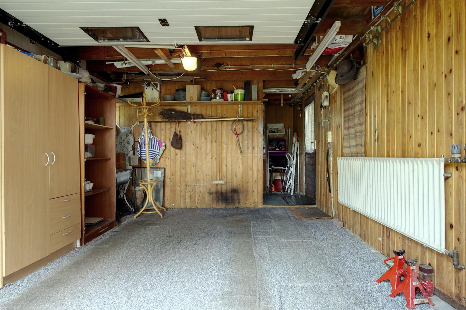 Begane grond: Hal/entree; dichte keuken met toegang tot kelder en een vaste kast; woonkamer-en-suite met inbouwkasten en erkers; aangebouwde slaapkamer (ca. 14 m²) met aangrenzende badkamer met douche, toilet en wastafel; bijkeuken met deur naar de eerder genoemde keuken alsmede een binnendoor naar de garage met elektrisch bedienbare sectionaaldeur en een loopdeur naar de tuin.