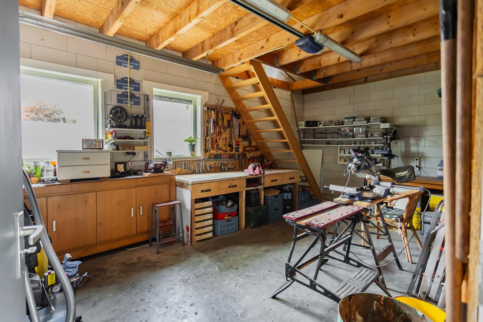 De woning beschikt over een zeer royale dubbele garage (samen ca. 48 m²), verdeeld in twee ruimtes van 26 m² en 15 m². De garage heeft een hoogte van 2,80 m en is ideaal voor meerdere auto’s, een werkplaats of opslag. In de garage is vloerverwarming voorzien, deze is echter nog niet aangesloten. Daarnaast is er in de garage nog een vaste trap naar een ruime zolder.