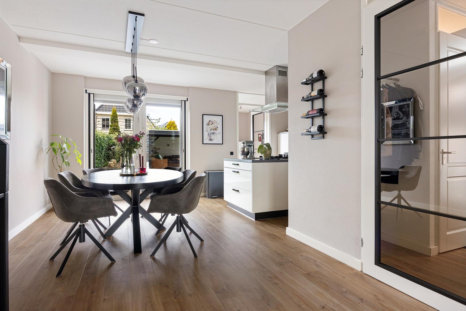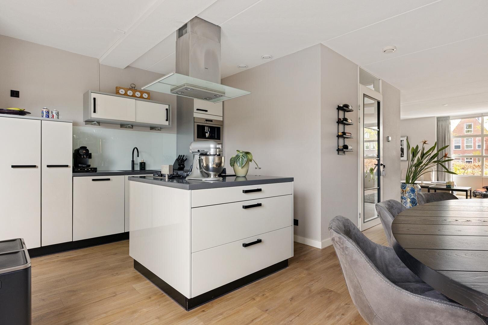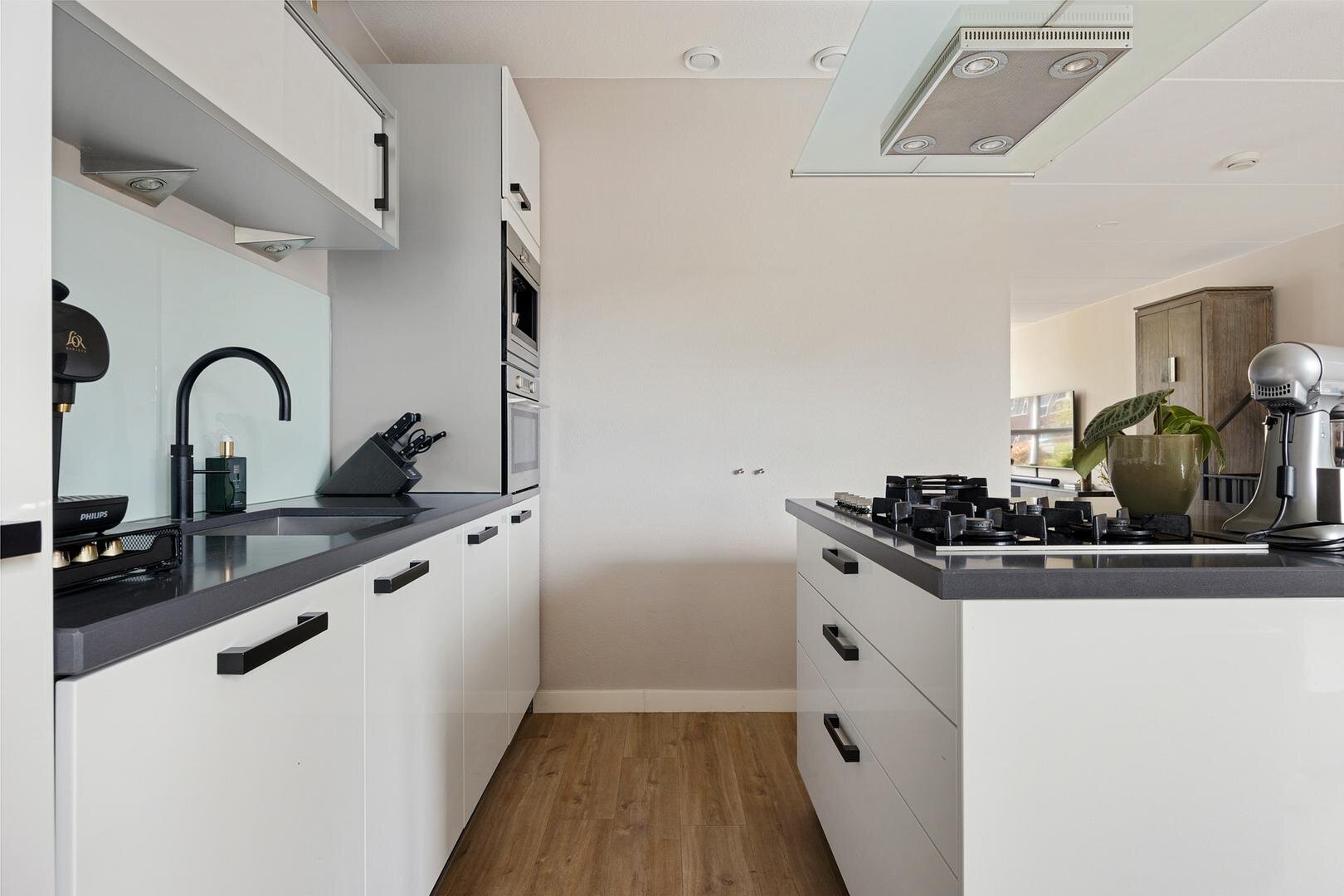 Ten tijde van de bouw is er gekozen voor een verlenging van de woonkamer aan de achterzijde waardoor een royale leefruimte van circa 55 m² is ontstaan. Via openslaande deuren bereik je de achtertuin en er is een open verbinding met de keuken. De keuken is modern uitgevoerd met een kookeiland en voorzien van diverse inbouwapparatuur en een Quooker. Vanuit de keuken is er toegang tot de bijkeuken met witgoedaansluitingen, deur naar de tuin en een binnendoor naar de verlengde garage met een deur naar de tuin en een kanteldeur naar de oprit.