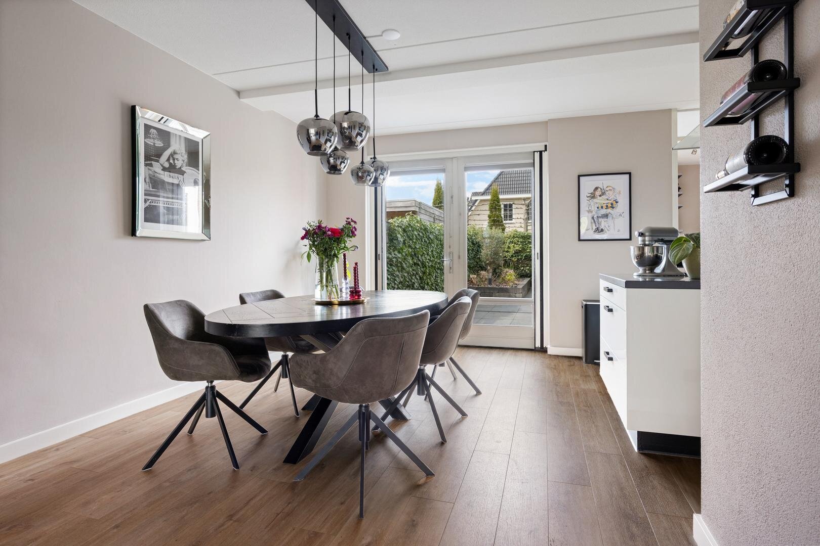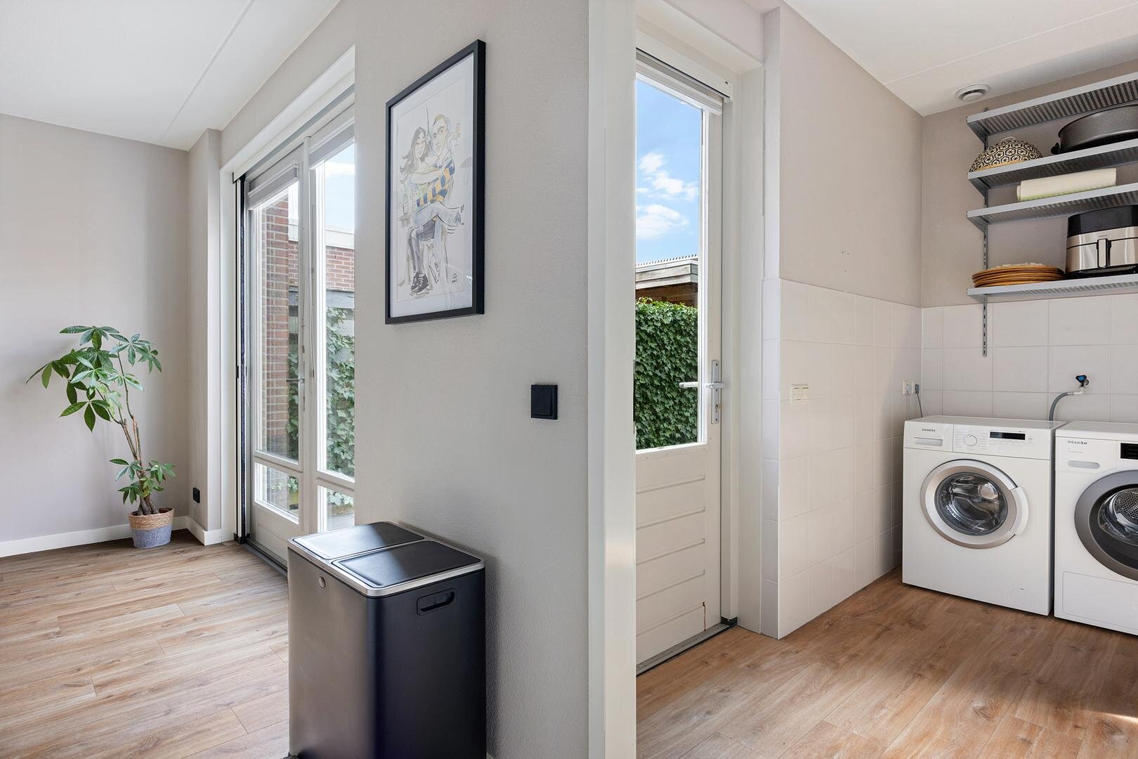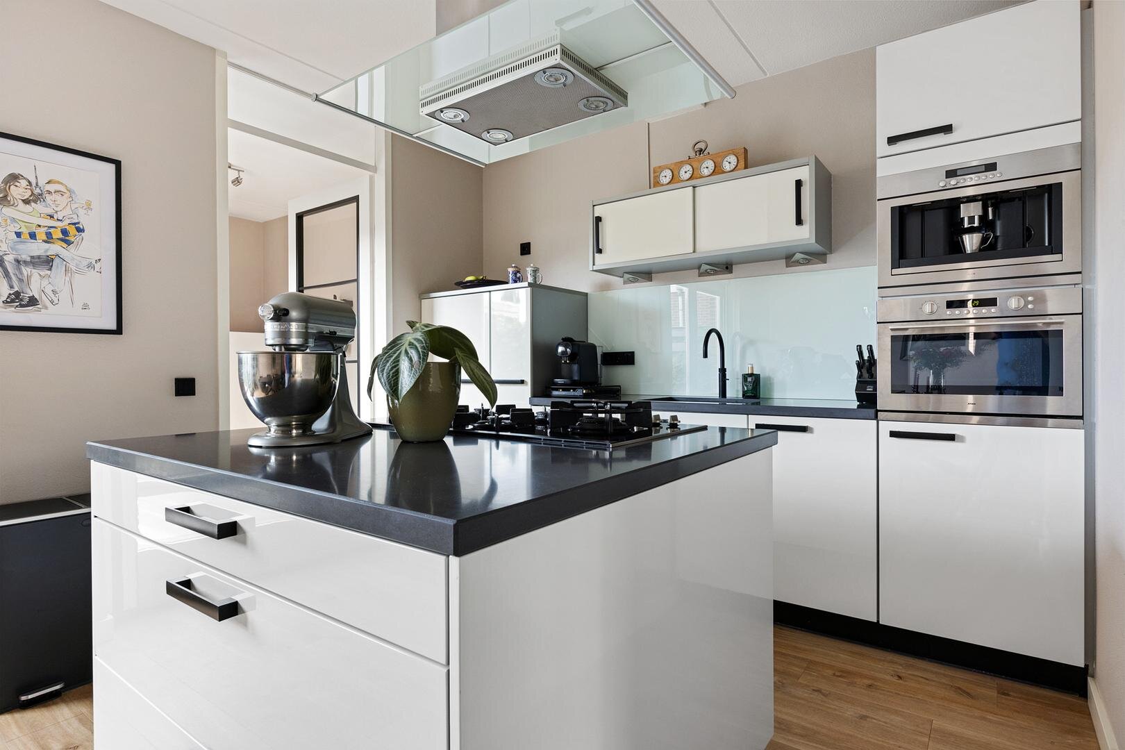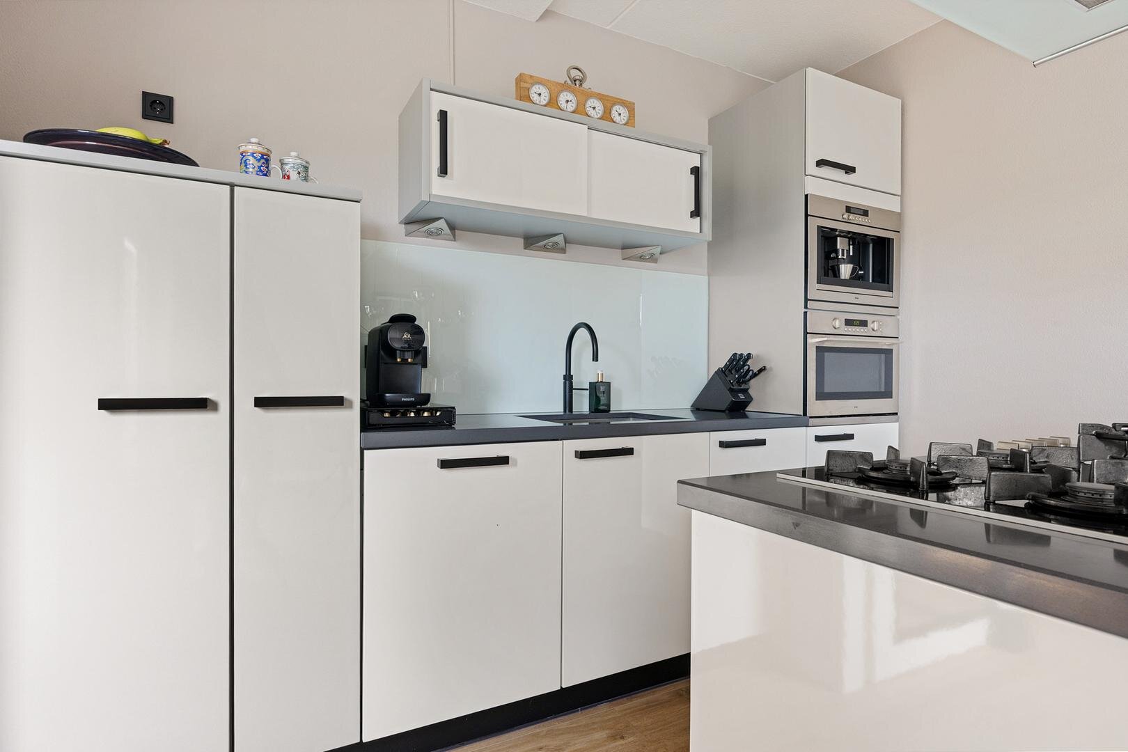 Ten tijde van de bouw is er gekozen voor een verlenging van de woonkamer aan de achterzijde waardoor een royale leefruimte van circa 55 m² is ontstaan. Via openslaande deuren bereik je de achtertuin en er is een open verbinding met de keuken. De keuken is modern uitgevoerd met een kookeiland en voorzien van diverse inbouwapparatuur en een Quooker. Vanuit de keuken is er toegang tot de bijkeuken met witgoedaansluitingen, deur naar de tuin en een binnendoor naar de verlengde garage met een deur naar de tuin en een kanteldeur naar de oprit.
