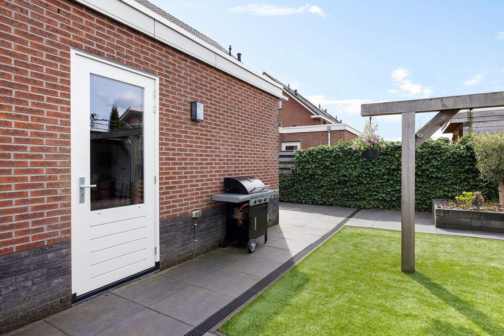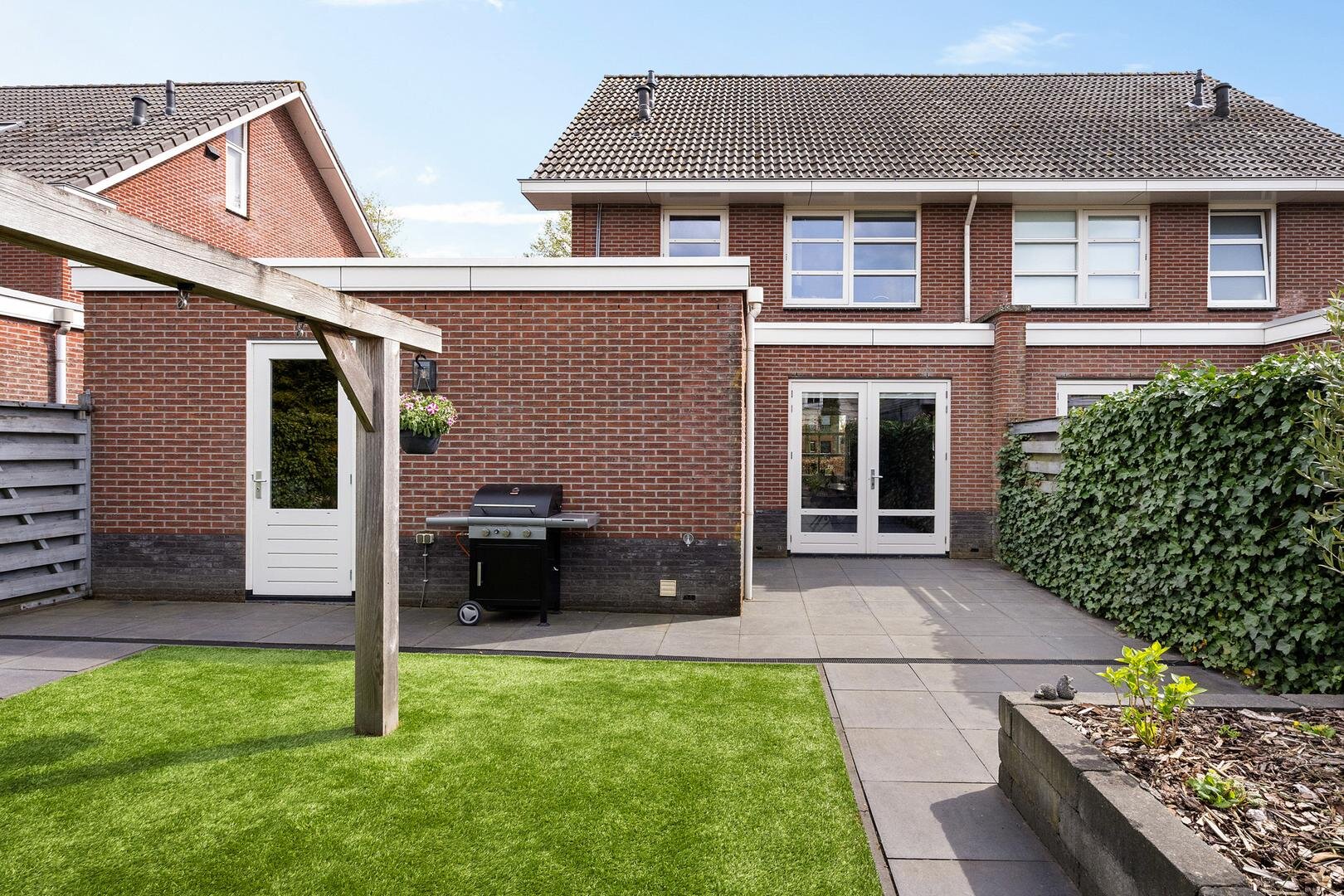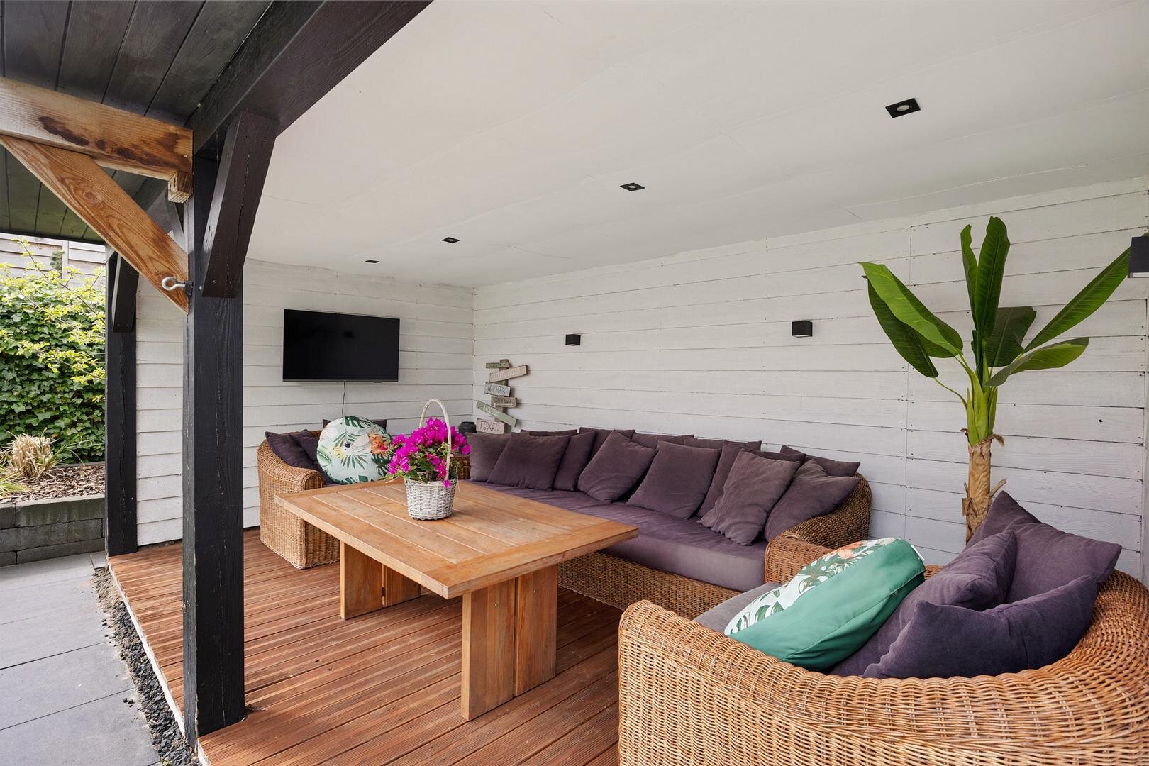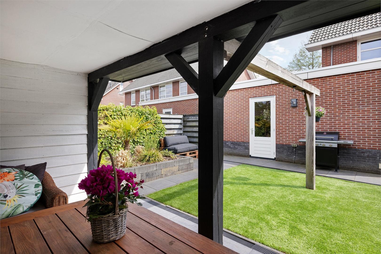 De achtertuin is verzorgd aangelegd en biedt veel privacy. De ligging op het noordwesten zorgt voor een prettige afwisseling van zon en schaduw gedurende de dag. Onder de veranda is het op warme dagen comfortabel en beschut zitten. Daarnaast is er voldoende ruimte voor speelruimte. Via het pad langs de garage kom je op de oprit welke plaats biedt aan meerdere auto’s en is voorzien van een laadpaal voor een elektrische auto.