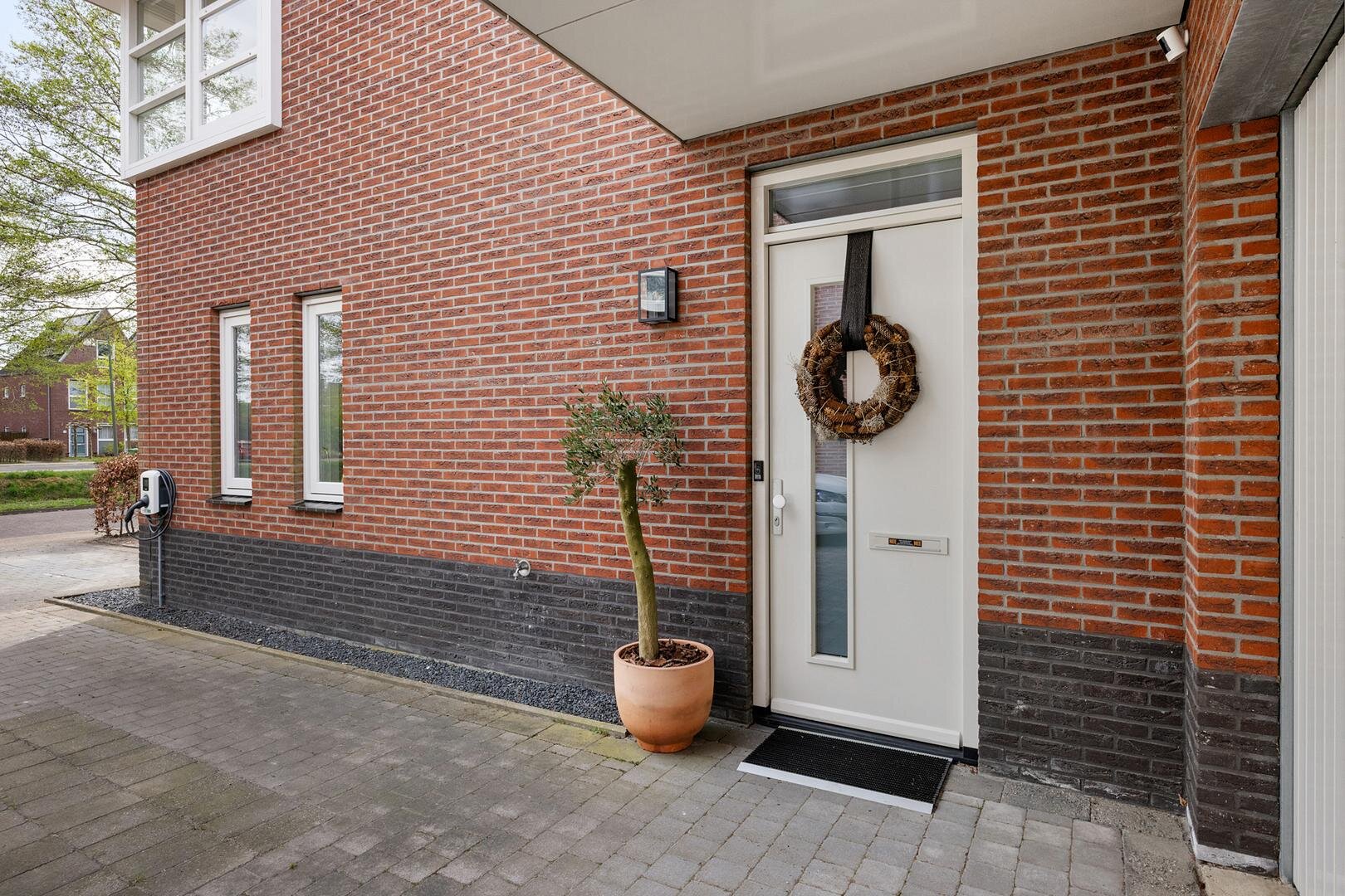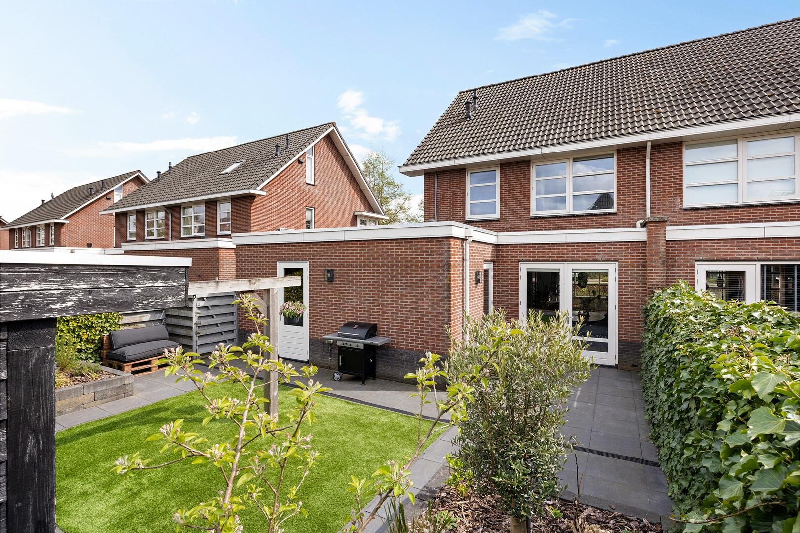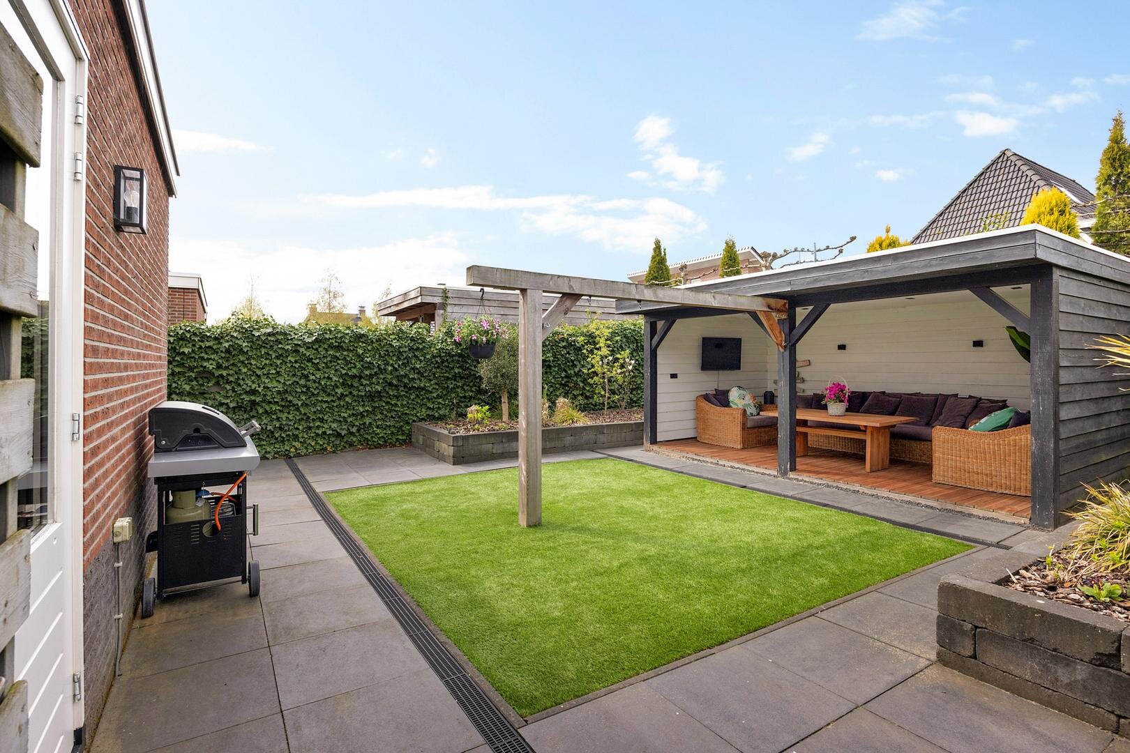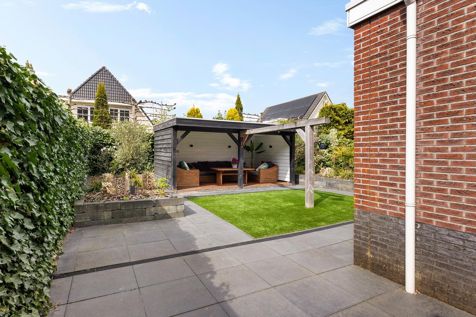 De achtertuin is verzorgd aangelegd en biedt veel privacy. De ligging op het noordwesten zorgt voor een prettige afwisseling van zon en schaduw gedurende de dag. Onder de veranda is het op warme dagen comfortabel en beschut zitten. Daarnaast is er voldoende ruimte voor speelruimte. Via het pad langs de garage kom je op de oprit welke plaats biedt aan meerdere auto’s en is voorzien van een laadpaal voor een elektrische auto.