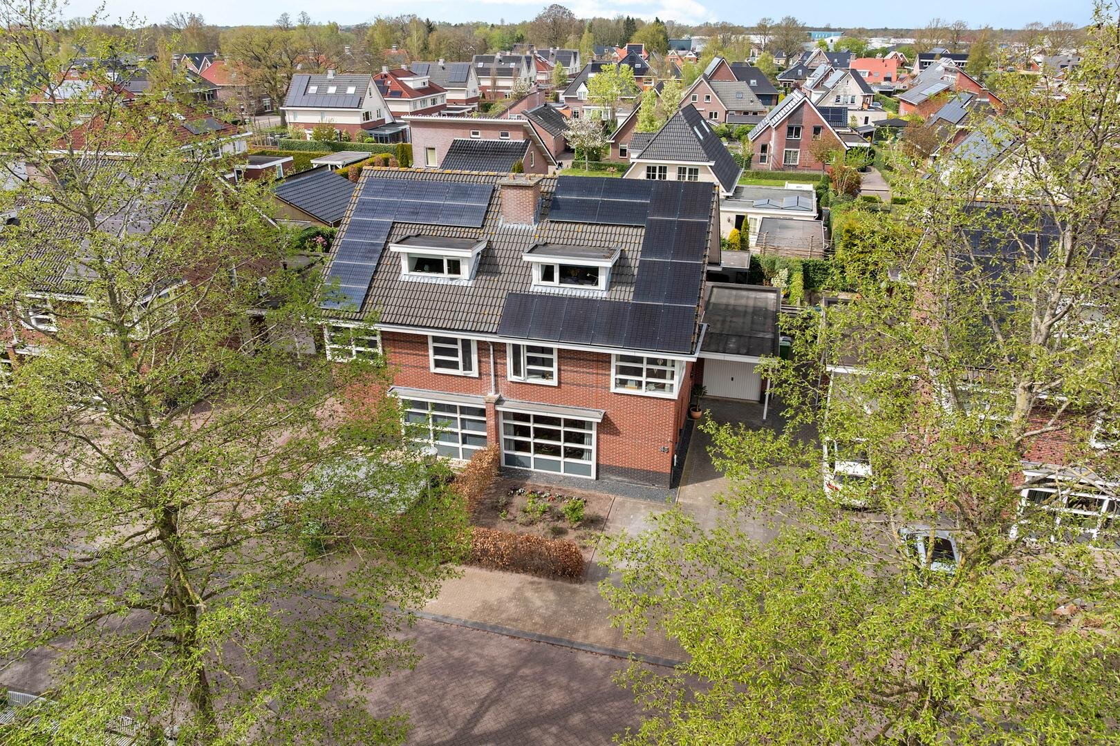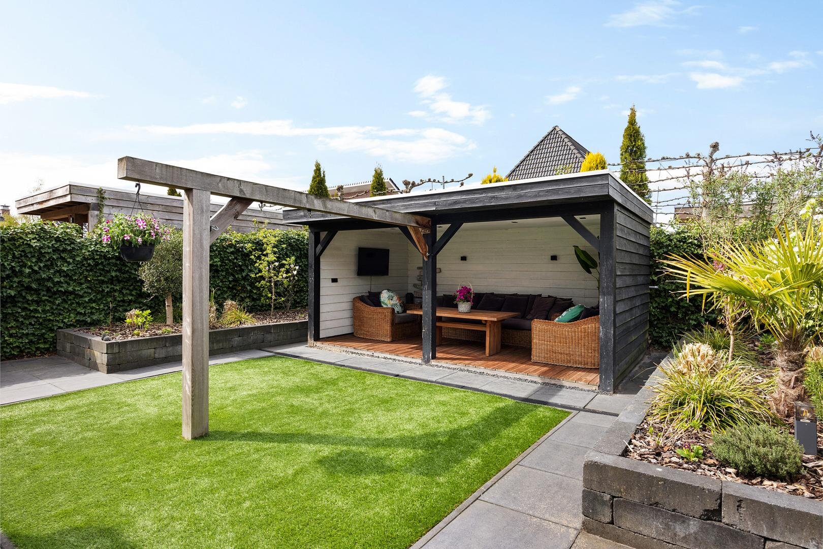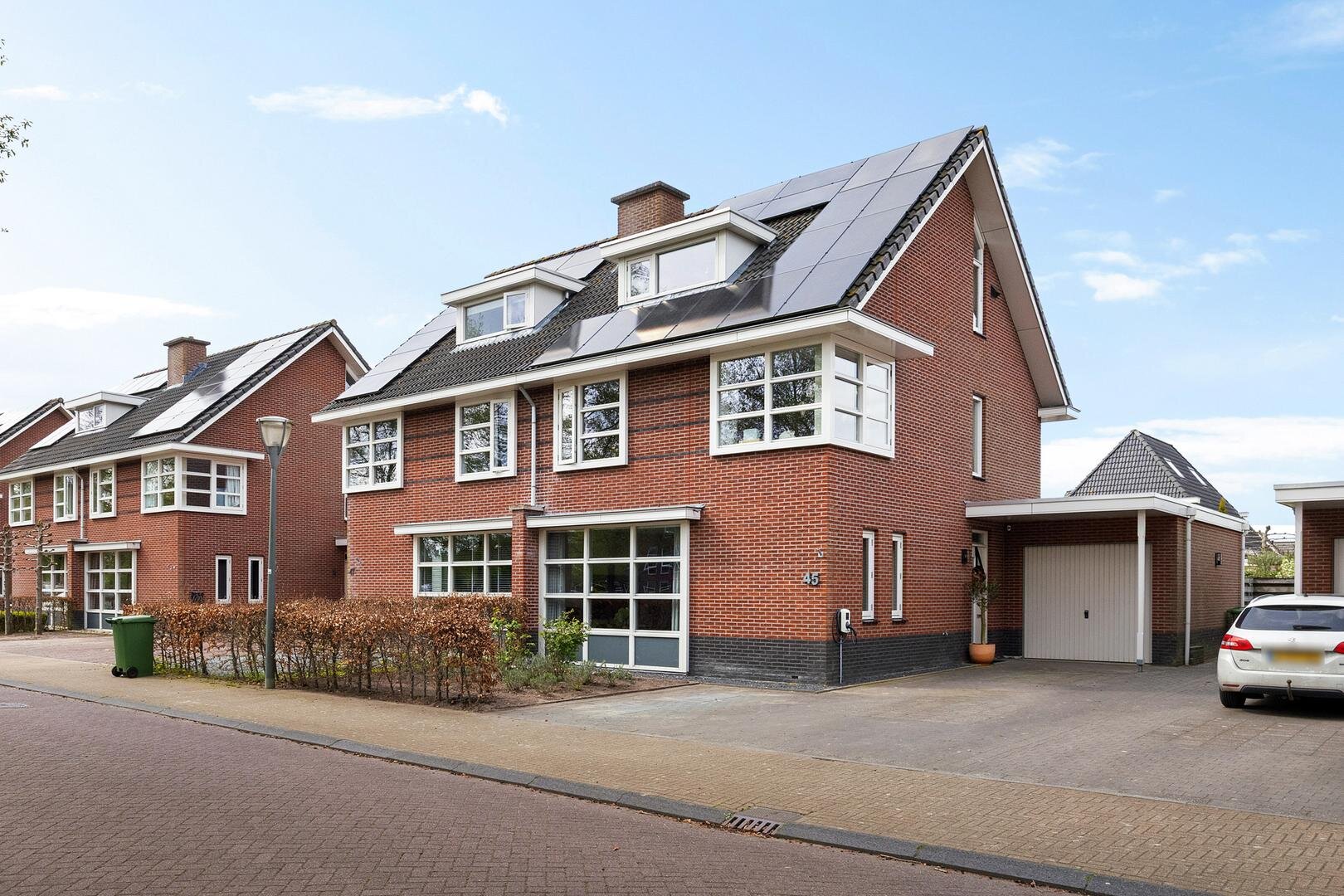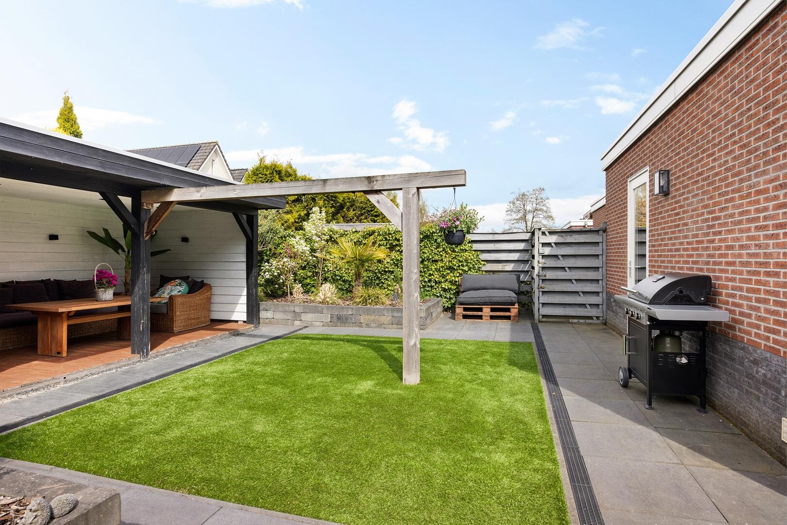 De achtertuin is verzorgd aangelegd en biedt veel privacy. De ligging op het noordwesten zorgt voor een prettige afwisseling van zon en schaduw gedurende de dag. Onder de veranda is het op warme dagen comfortabel en beschut zitten. Daarnaast is er voldoende ruimte voor speelruimte. Via het pad langs de garage kom je op de oprit welke plaats biedt aan meerdere auto’s en is voorzien van een laadpaal voor een elektrische auto.