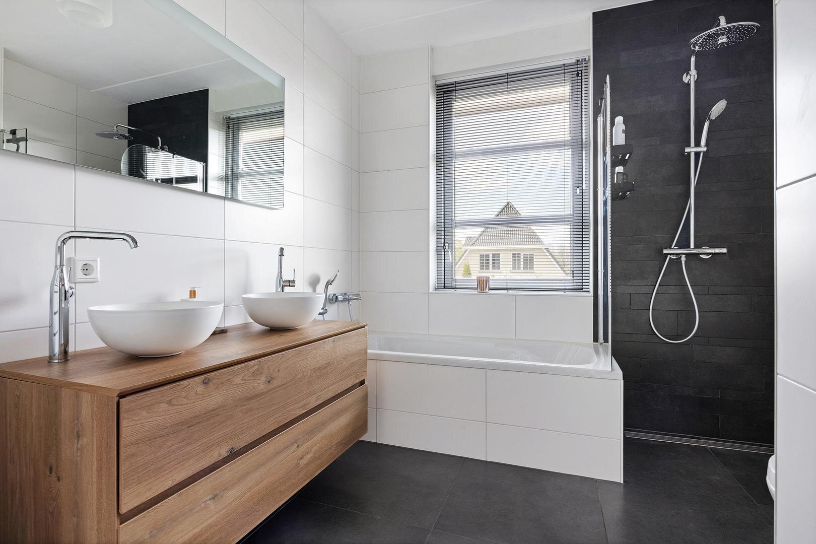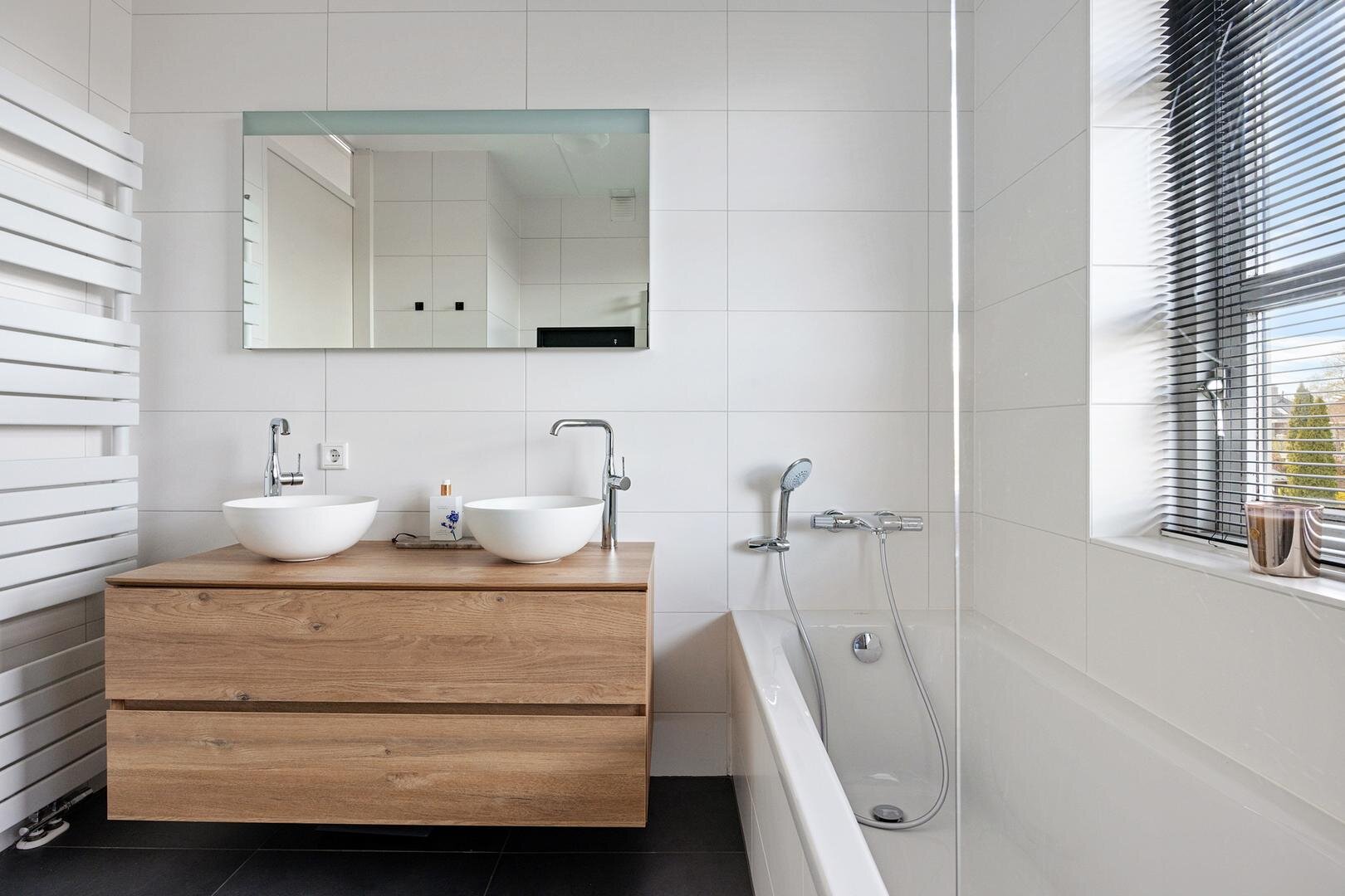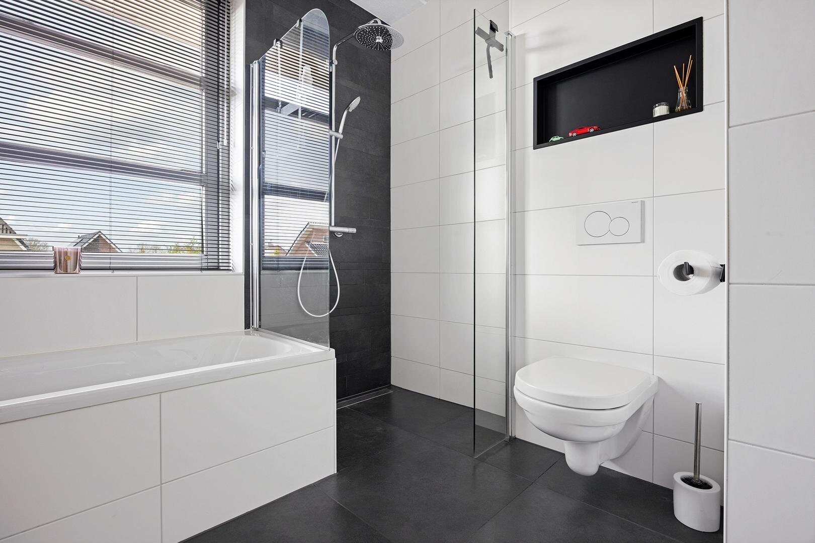 De overloop met daglicht en cv-kast geeft toegang tot 3 slaapkamers van circa 11, 12 en 14 m². De badkamer met vloerverwarming is modern uitgevoerd en voorzien van een ligbad, inloopdouche, toilet en wastafelmeubel met 2 waskommen.
