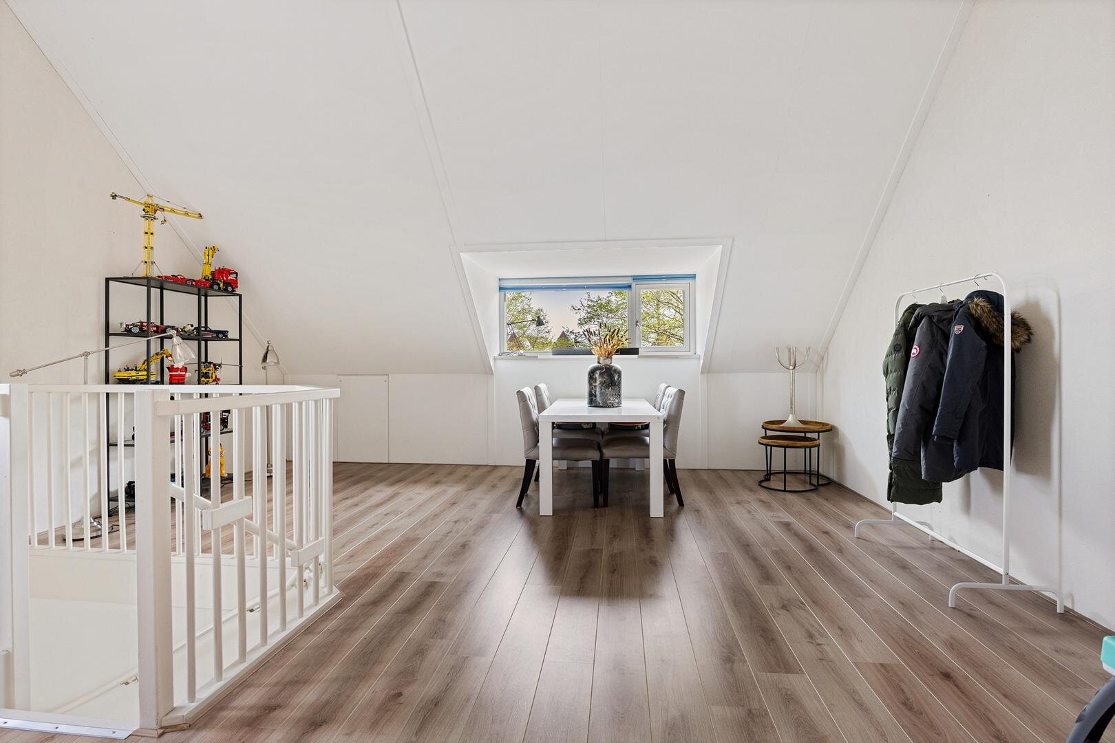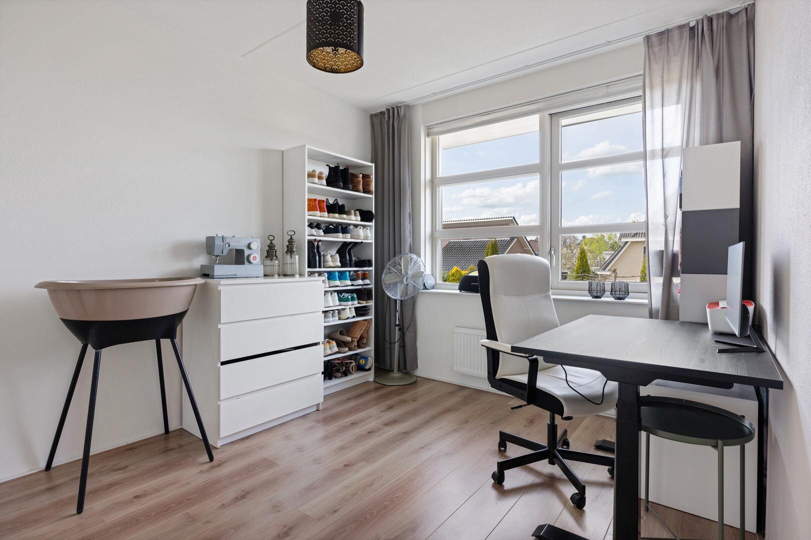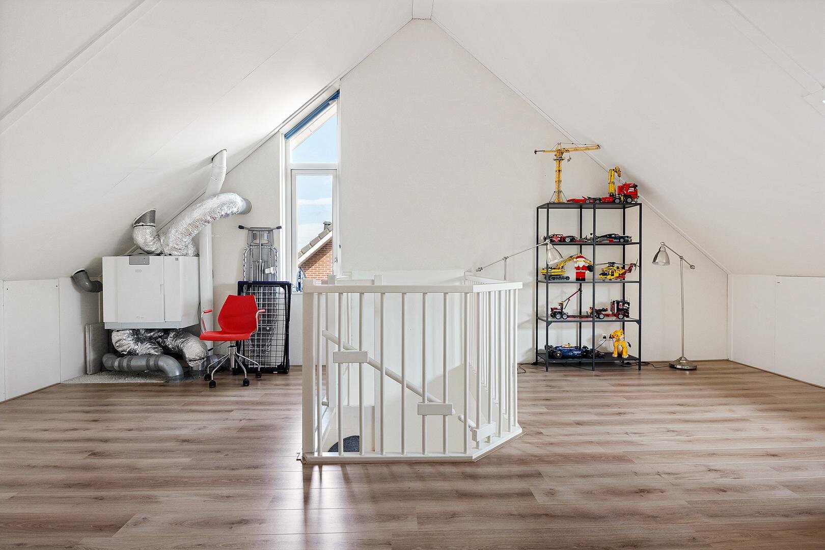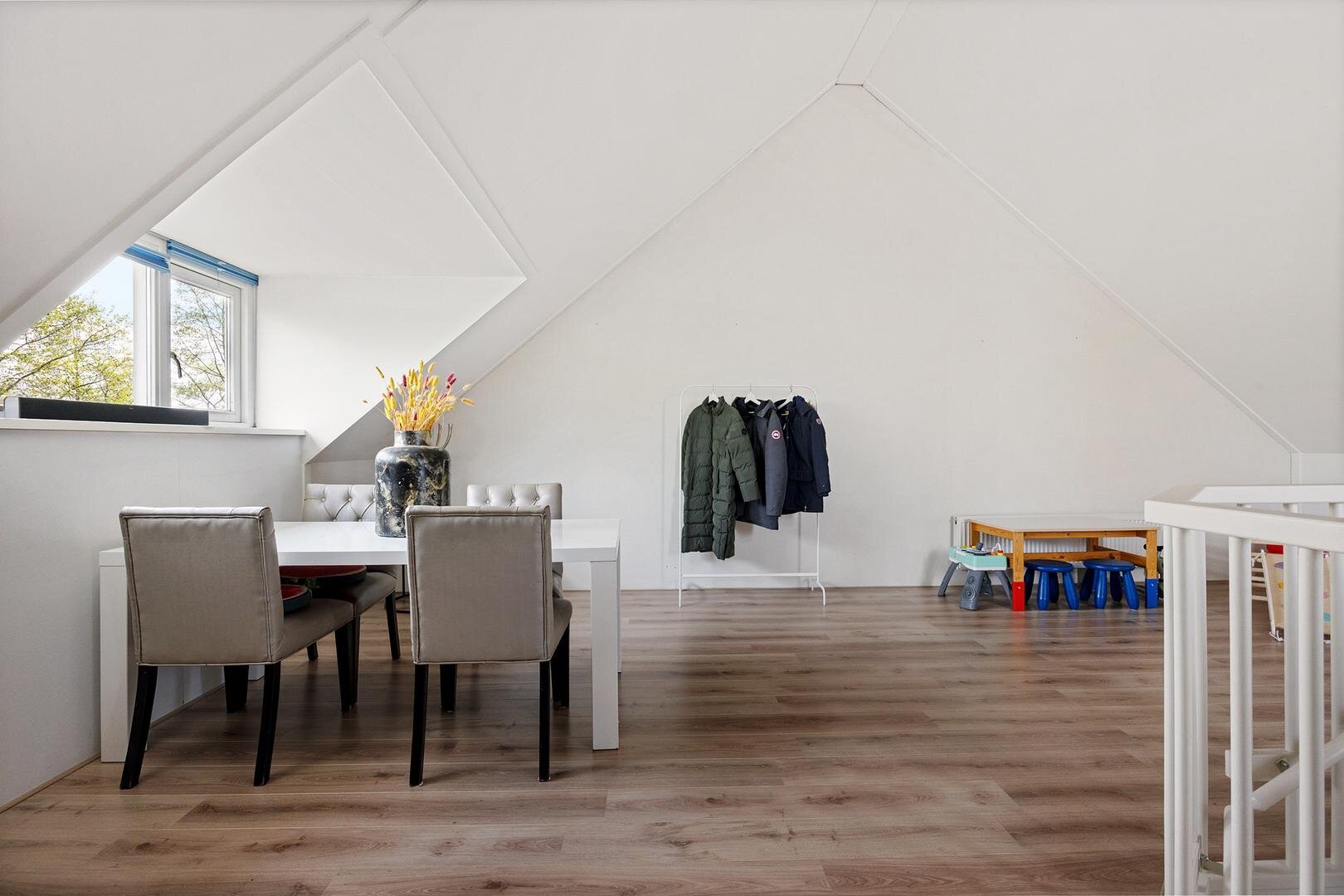 Via een vaste trap bereik je de ruime zolderverdieping van circa 35 m² met dakkapel. Deze ruimte is momenteel open, maar kan eenvoudig worden ingedeeld in één of twee extra slaapkamers. Daarnaast is er bergruimte aanwezig achter de knieschotten.